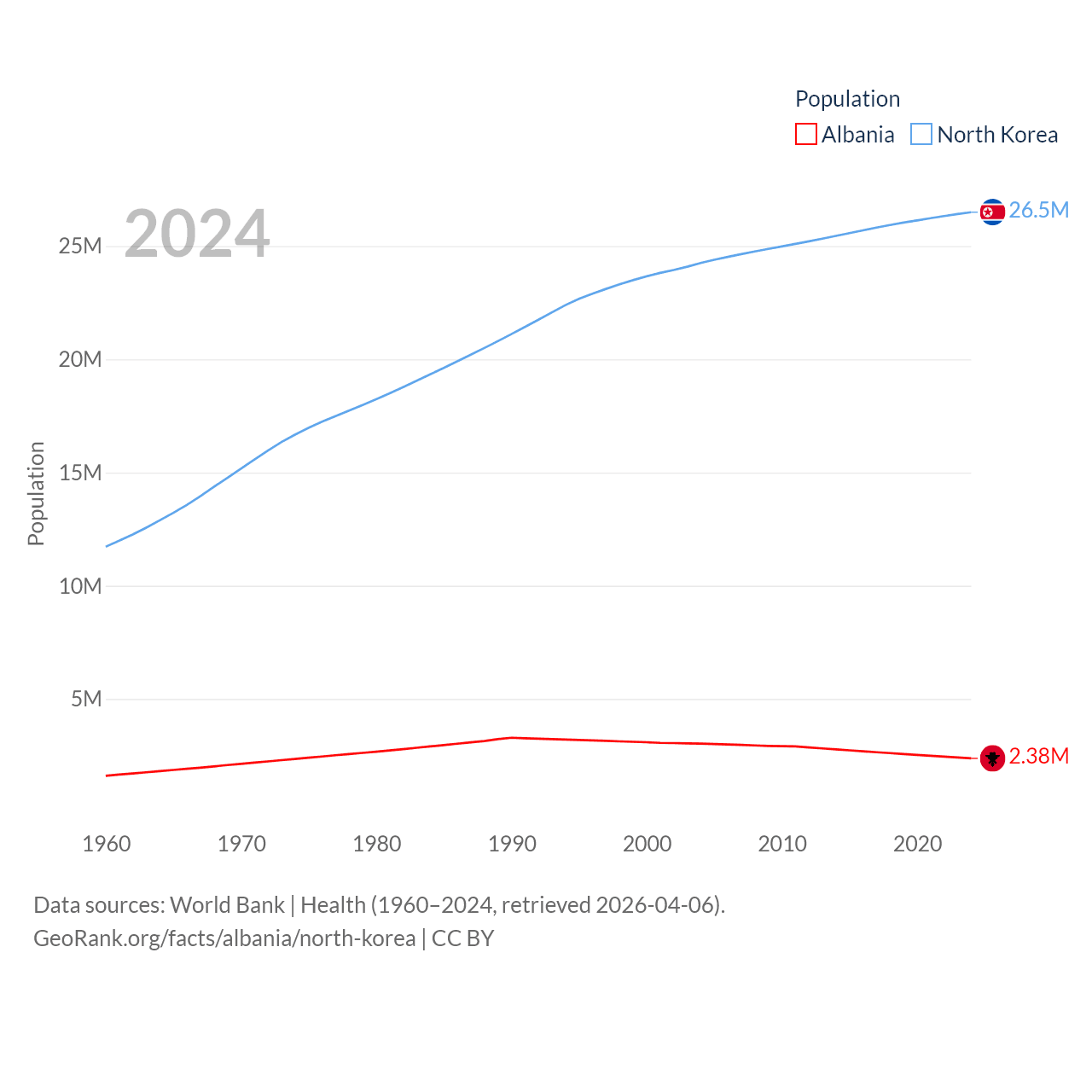 Albania has a population of 2.38M (ranked 144/197), compared with 26.5M in North Korea (ranked 56/197). Albania's land area is 10,579 sq mi versus 46,491 sq mi for North Korea (ranked 143rd vs. 97th).