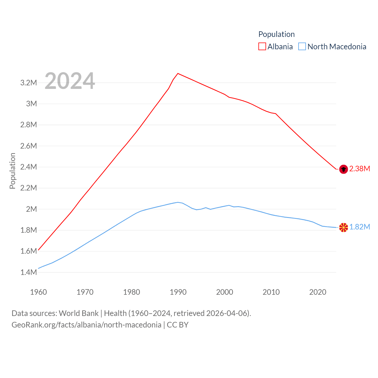 Albania has a population of 2.38M (ranked 144/197), compared with 1.82M in North Macedonia (ranked 150/197). Albania's land area is 10,579 sq mi versus 9,737 sq mi for North Macedonia (ranked 143rd vs. 145th).