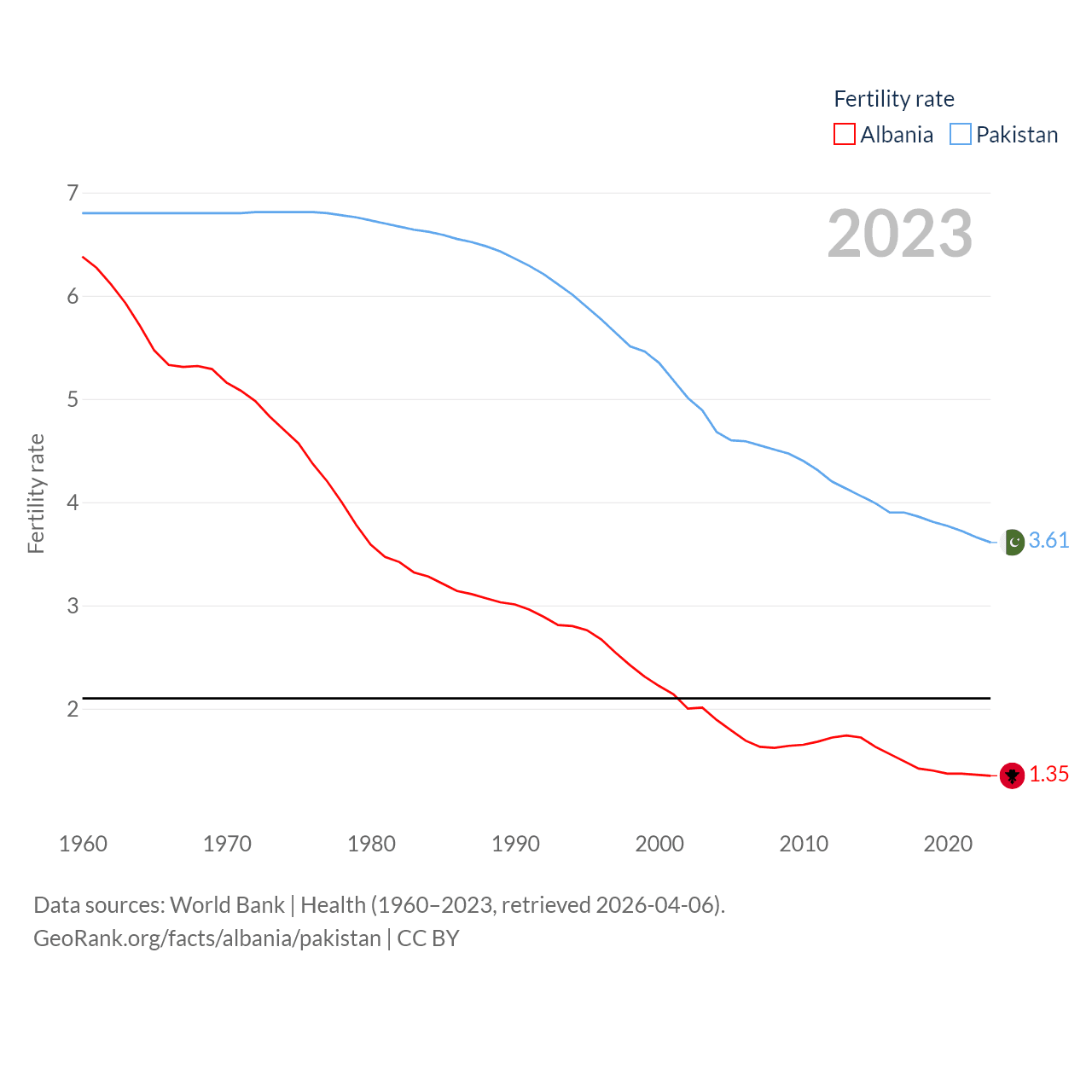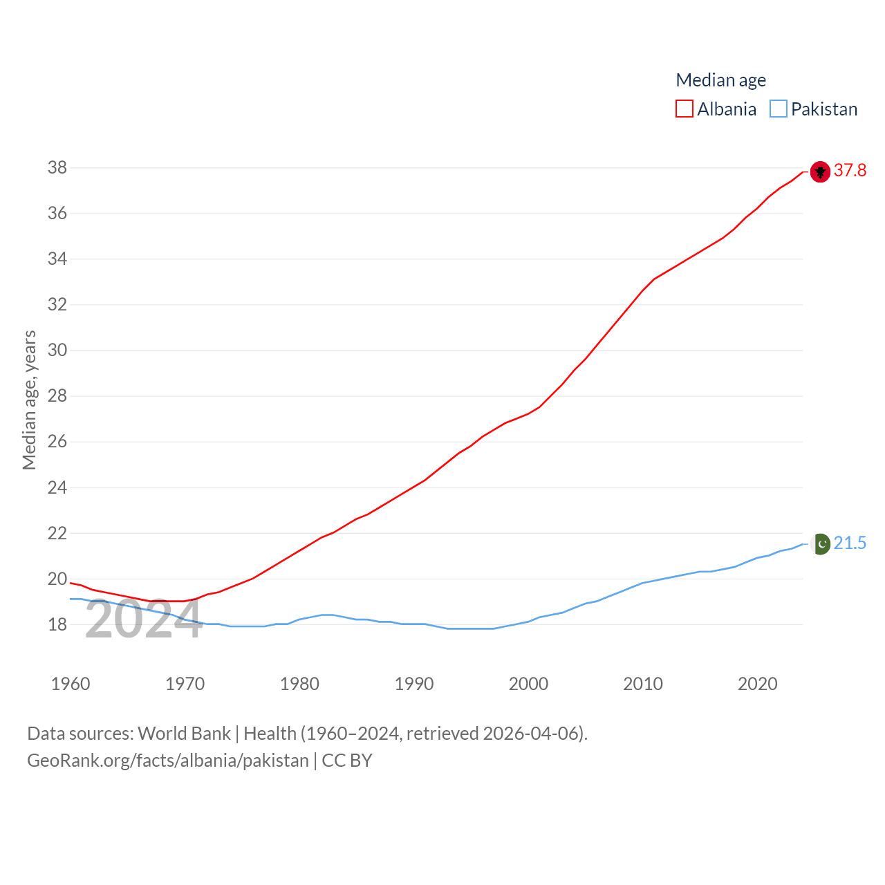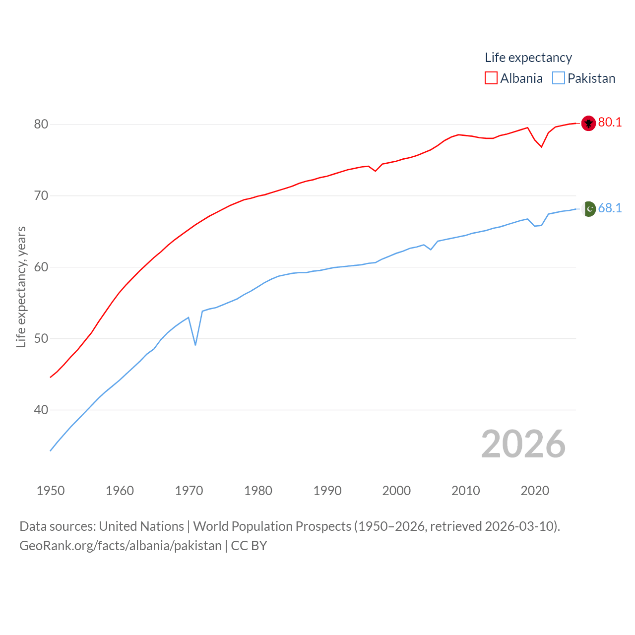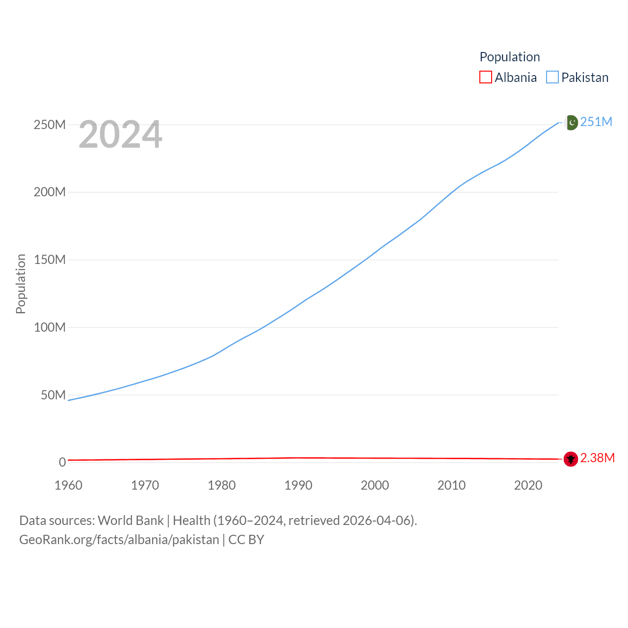 Albania has a population of 2.38M (ranked 144/197), compared with 251M in Pakistan (ranked 5/197). Albania's land area is 10,579 sq mi versus 297,638 sq mi for Pakistan (ranked 143rd vs. 35th).