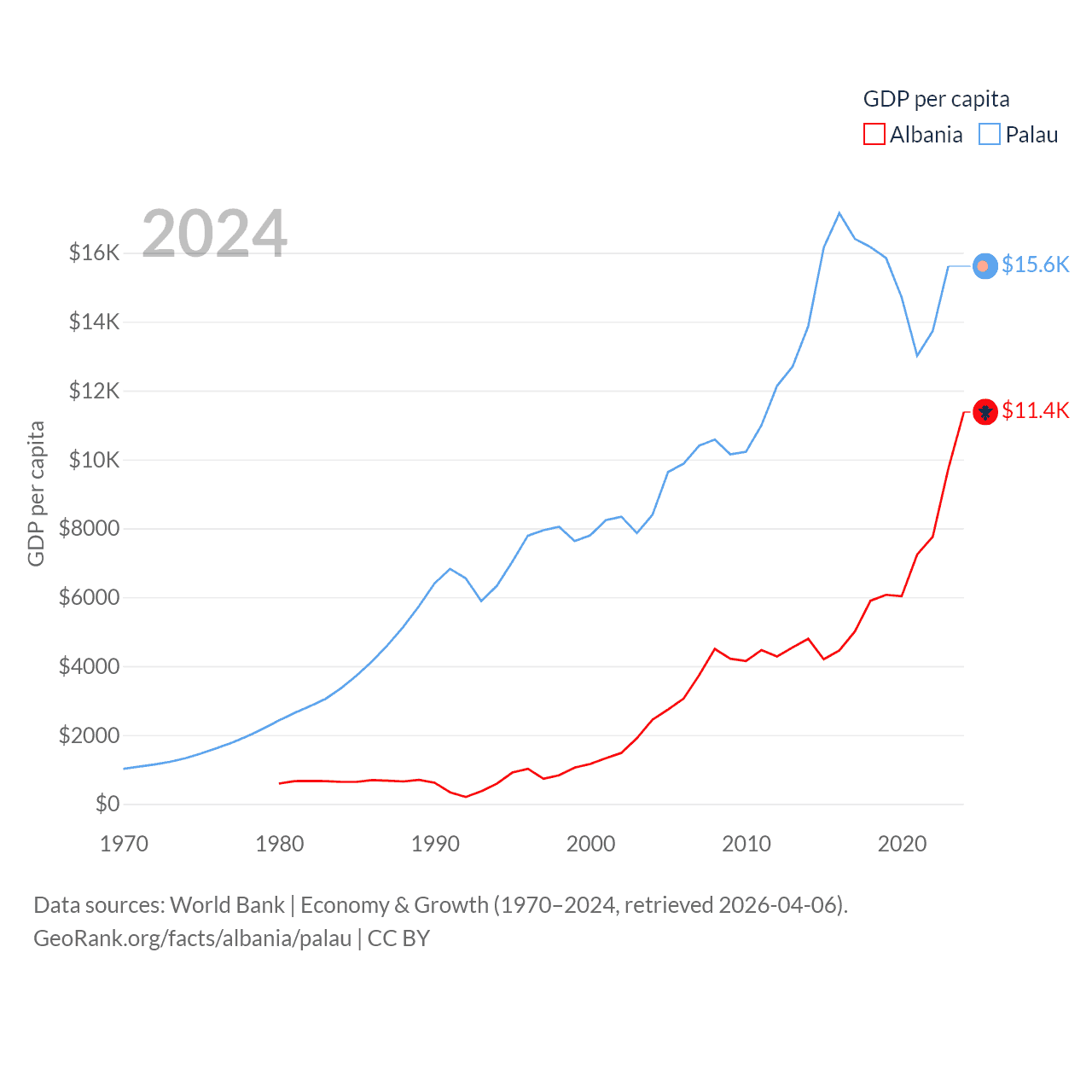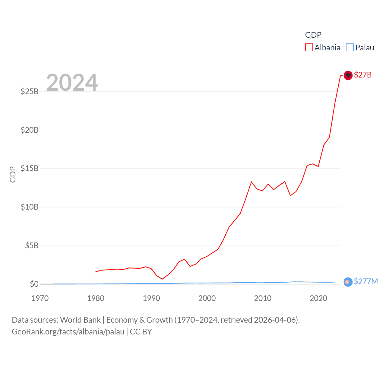 By GDP, Albania ranks 112/197 ($27B) and Palau ranks 194/197 ($277M). By GDP per capita, Albania ranks 82/197 ($11,378), while Palau ranks 67/197 ($15,611).