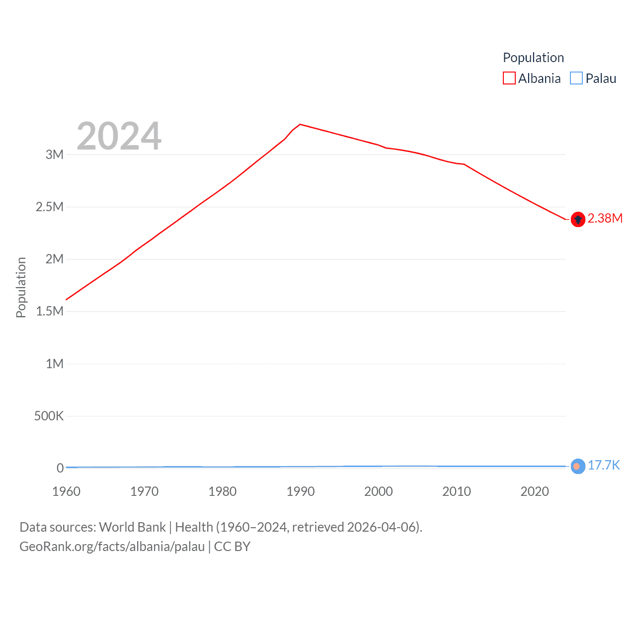 Albania has a population of 2.38M (ranked 144/197), compared with 17.7K in Palau (ranked 194/197). Albania's land area is 10,579 sq mi versus 177.6 sq mi for Palau (ranked 143rd vs. 180th).