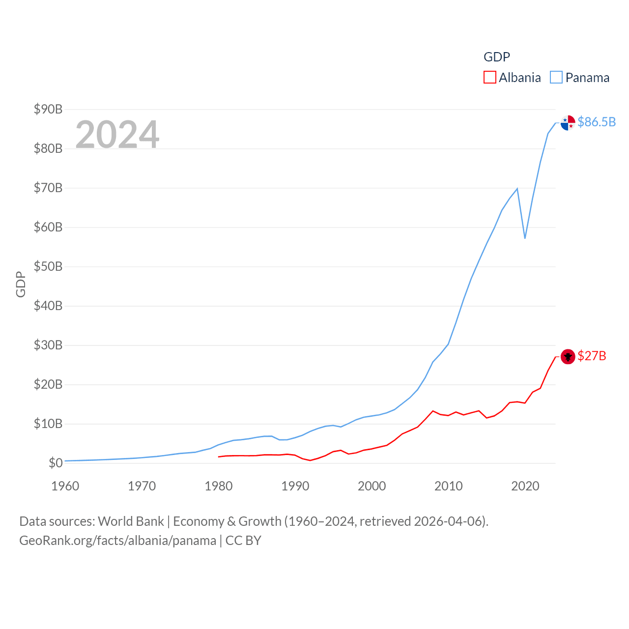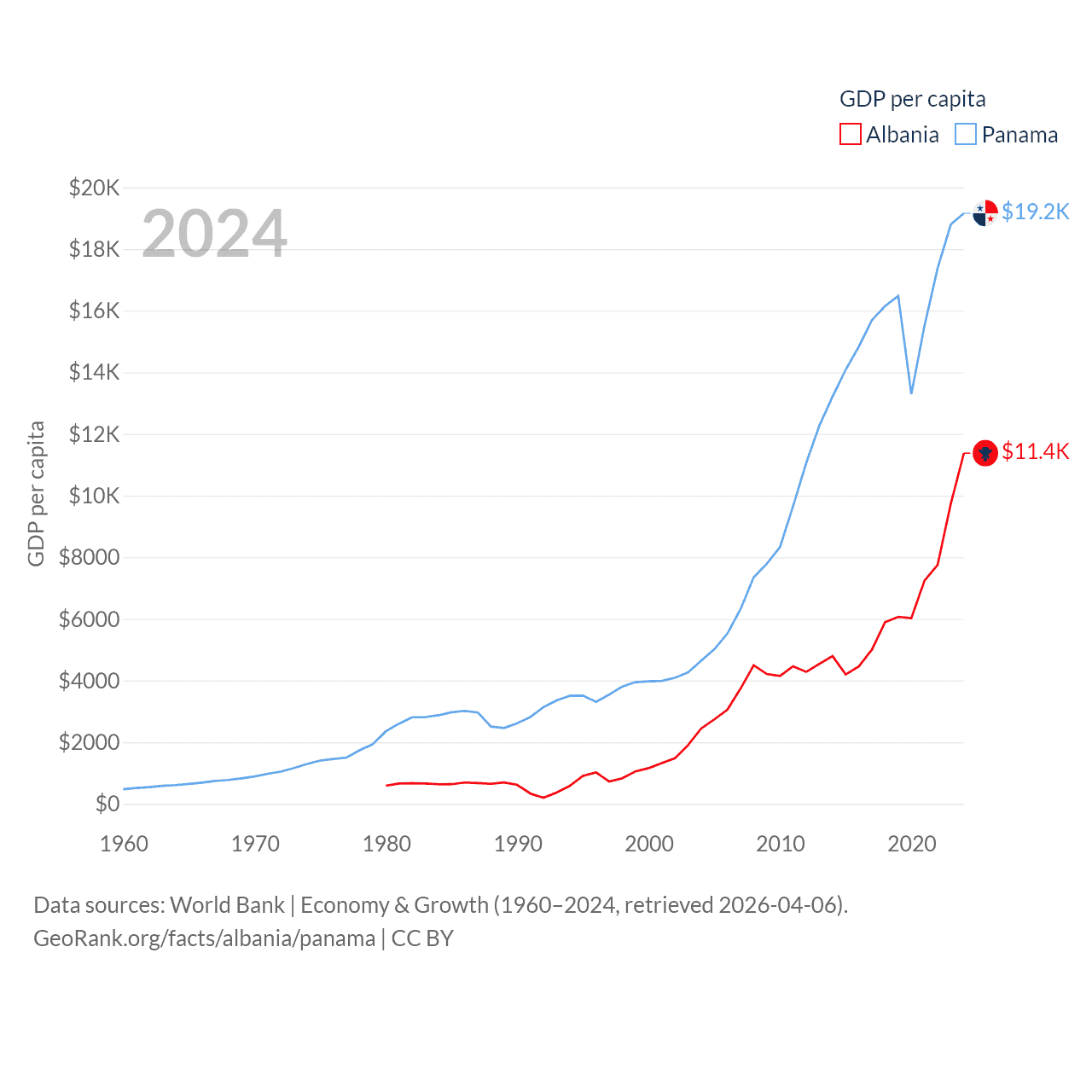 By GDP, Albania ranks 112/197 ($27B) and Panama ranks 78/197 ($86.5B). By GDP per capita, Albania ranks 82/197 ($11,378), while Panama ranks 60/197 ($19,161).