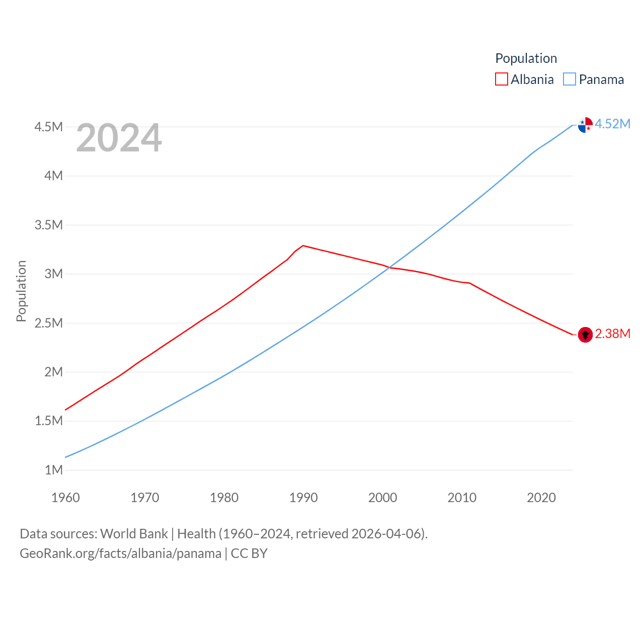 Albania has a population of 2.38M (ranked 144/197), compared with 4.52M in Panama (ranked 128/197). Albania's land area is 10,579 sq mi versus 28,641 sq mi for Panama (ranked 143rd vs. 115th).