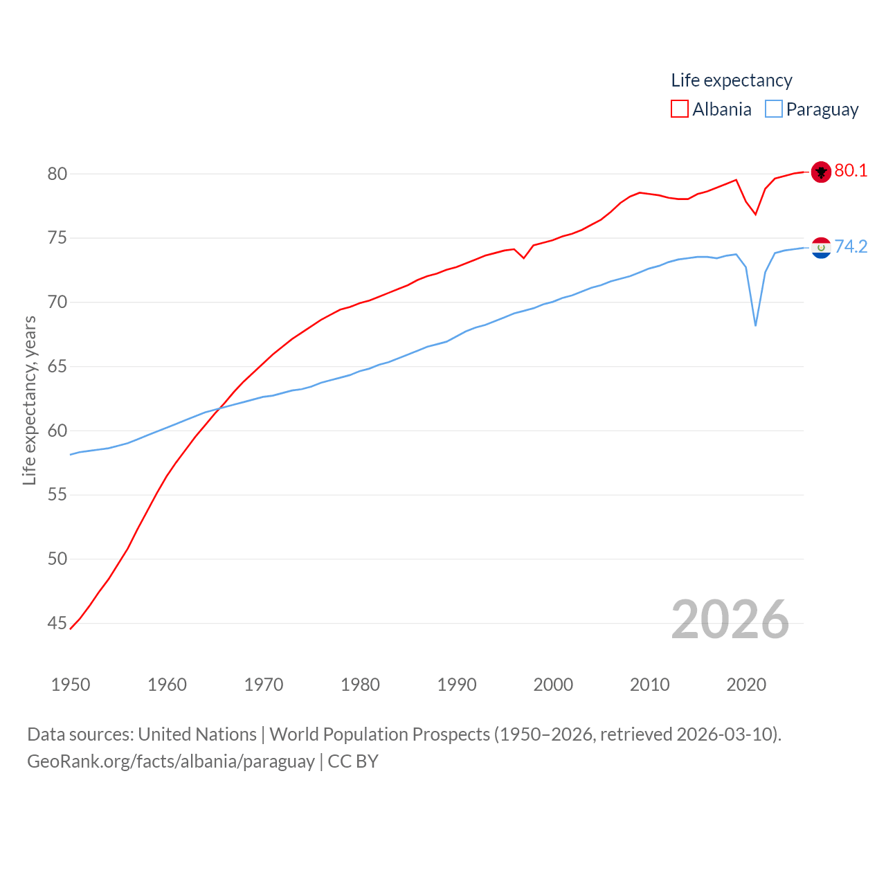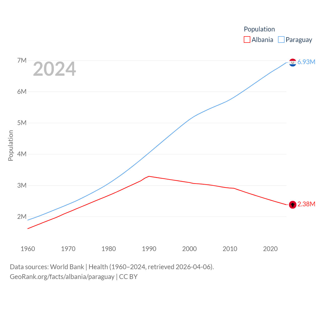 Albania has a population of 2.38M (ranked 144/197), compared with 6.93M in Paraguay (ranked 107/197). Albania's land area is 10,579 sq mi versus 152,901 sq mi for Paraguay (ranked 143rd vs. 59th).
