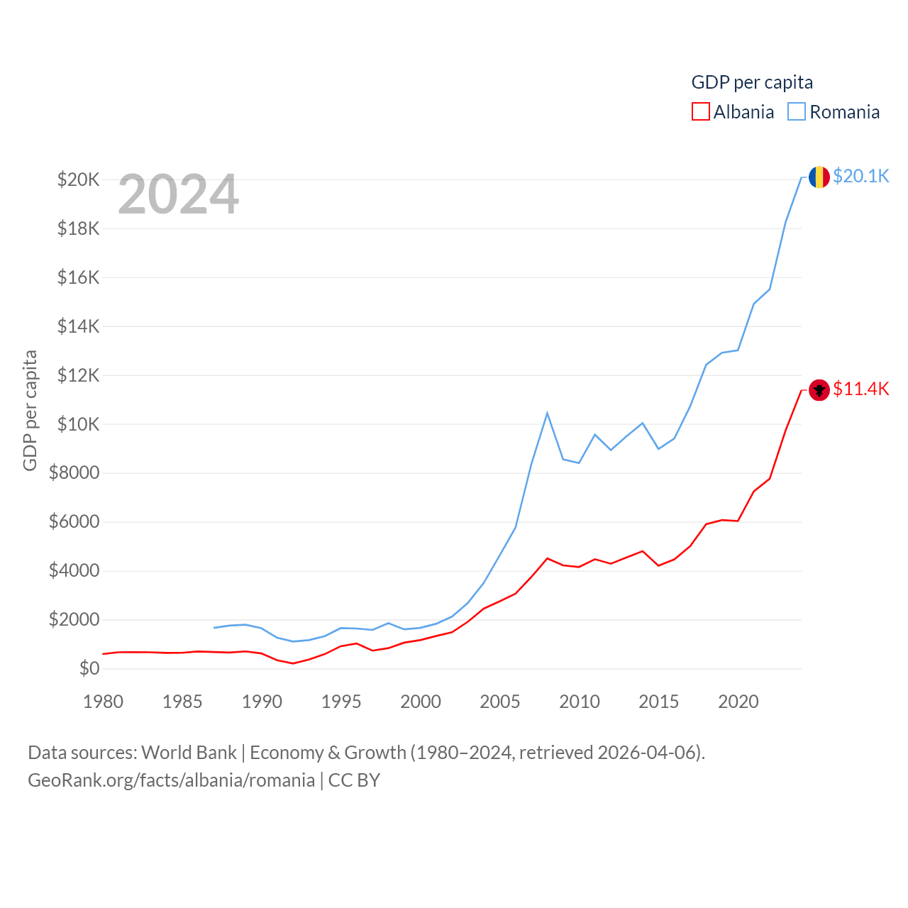 By GDP, Albania ranks 112/197 ($27B) and Romania ranks 42/197 ($383B). By GDP per capita, Albania ranks 82/197 ($11,378), while Romania ranks 58/197 ($20,080).
