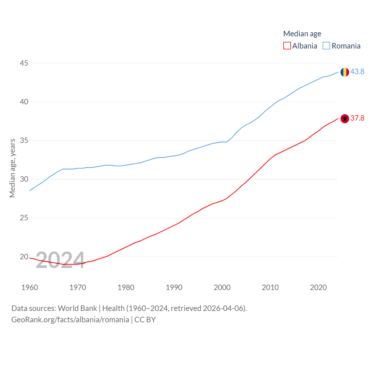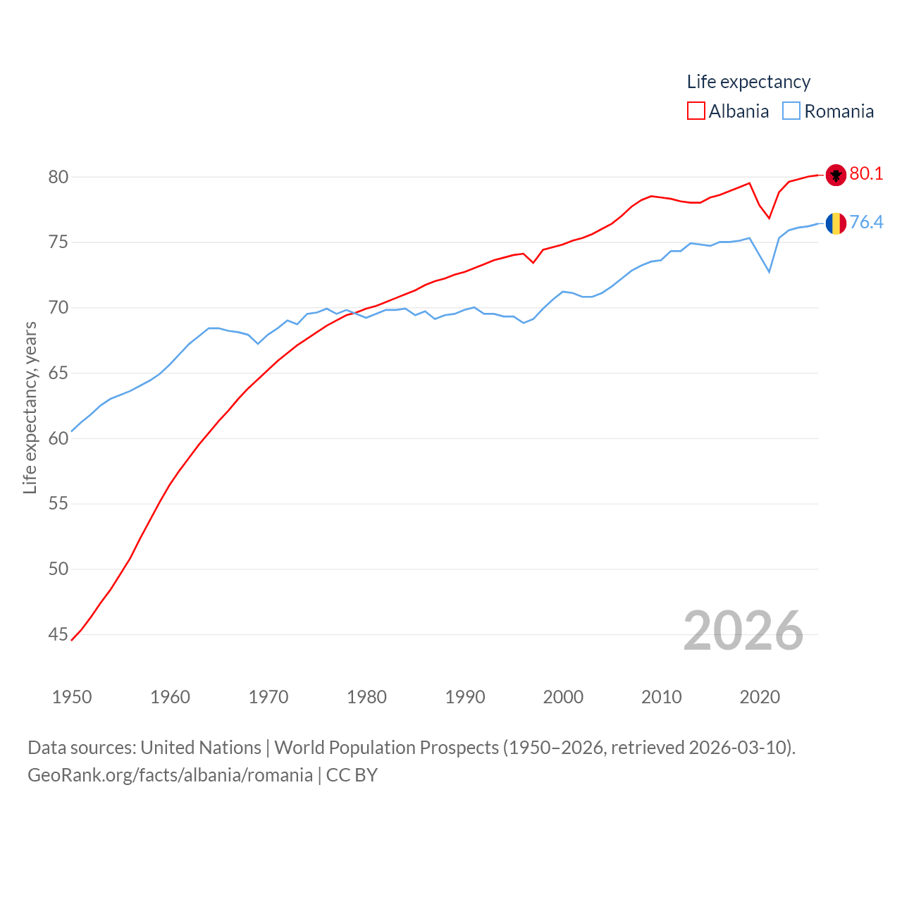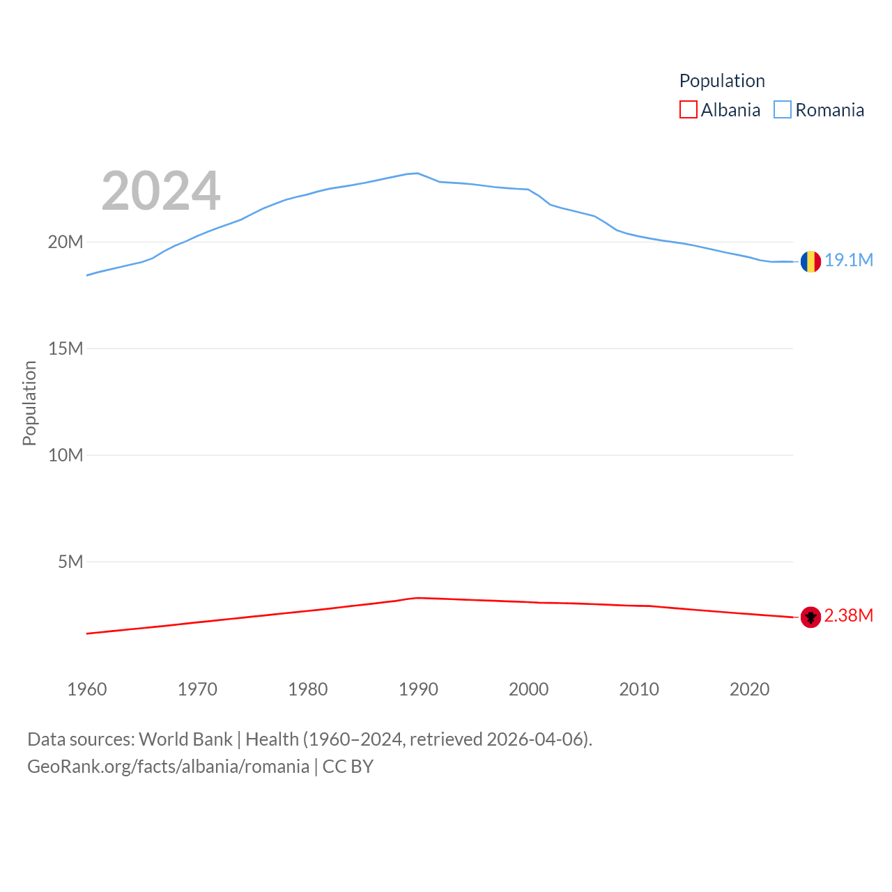 Albania has a population of 2.38M (ranked 144/197), compared with 19.1M in Romania (ranked 67/197). Albania's land area is 10,579 sq mi versus 88,834 sq mi for Romania (ranked 143rd vs. 80th).