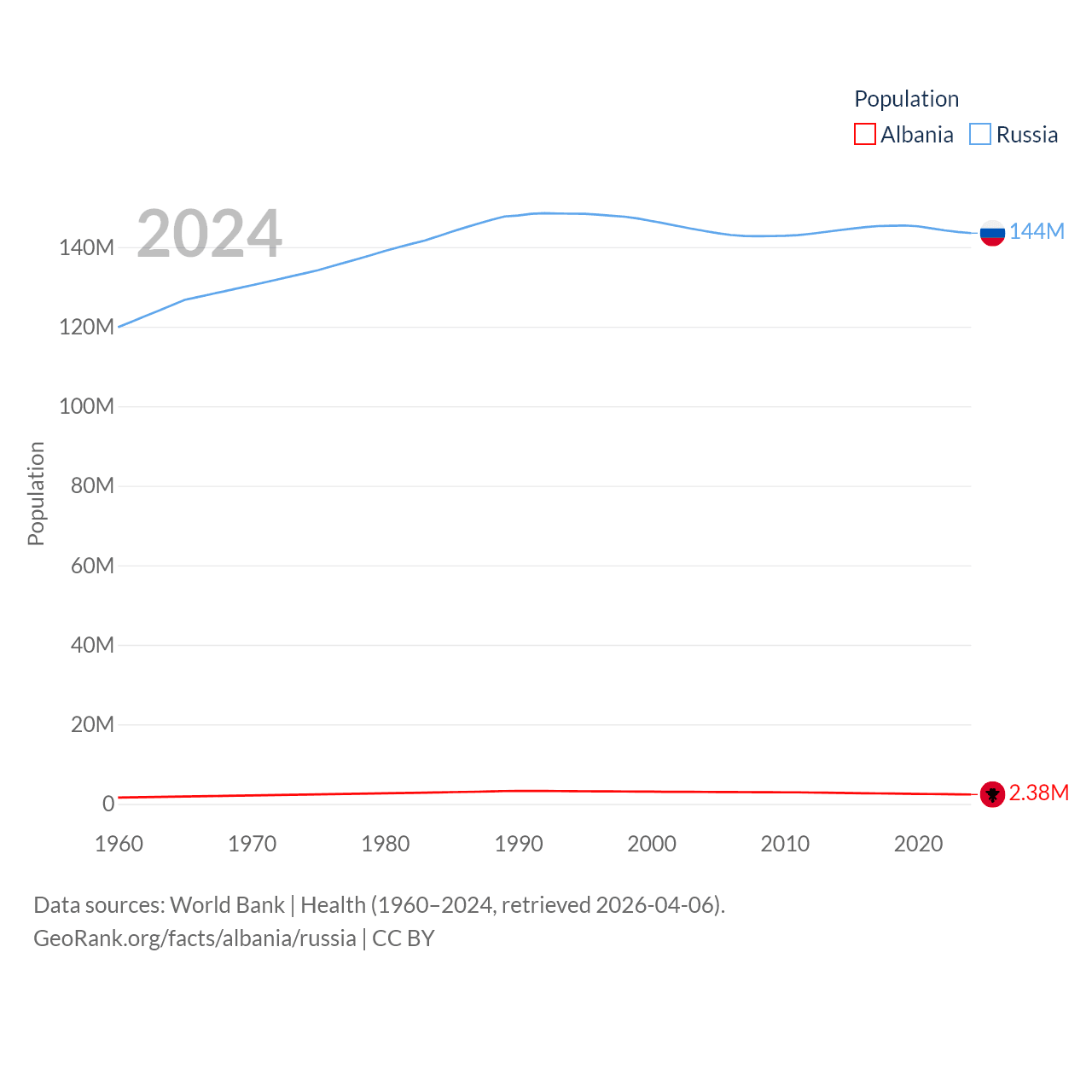 Albania has a population of 2.38M (ranked 144/197), compared with 144M in Russia (ranked 9/197). Albania's land area is 10,579 sq mi versus 6,323,145 sq mi for Russia (ranked 143rd vs. 1st).