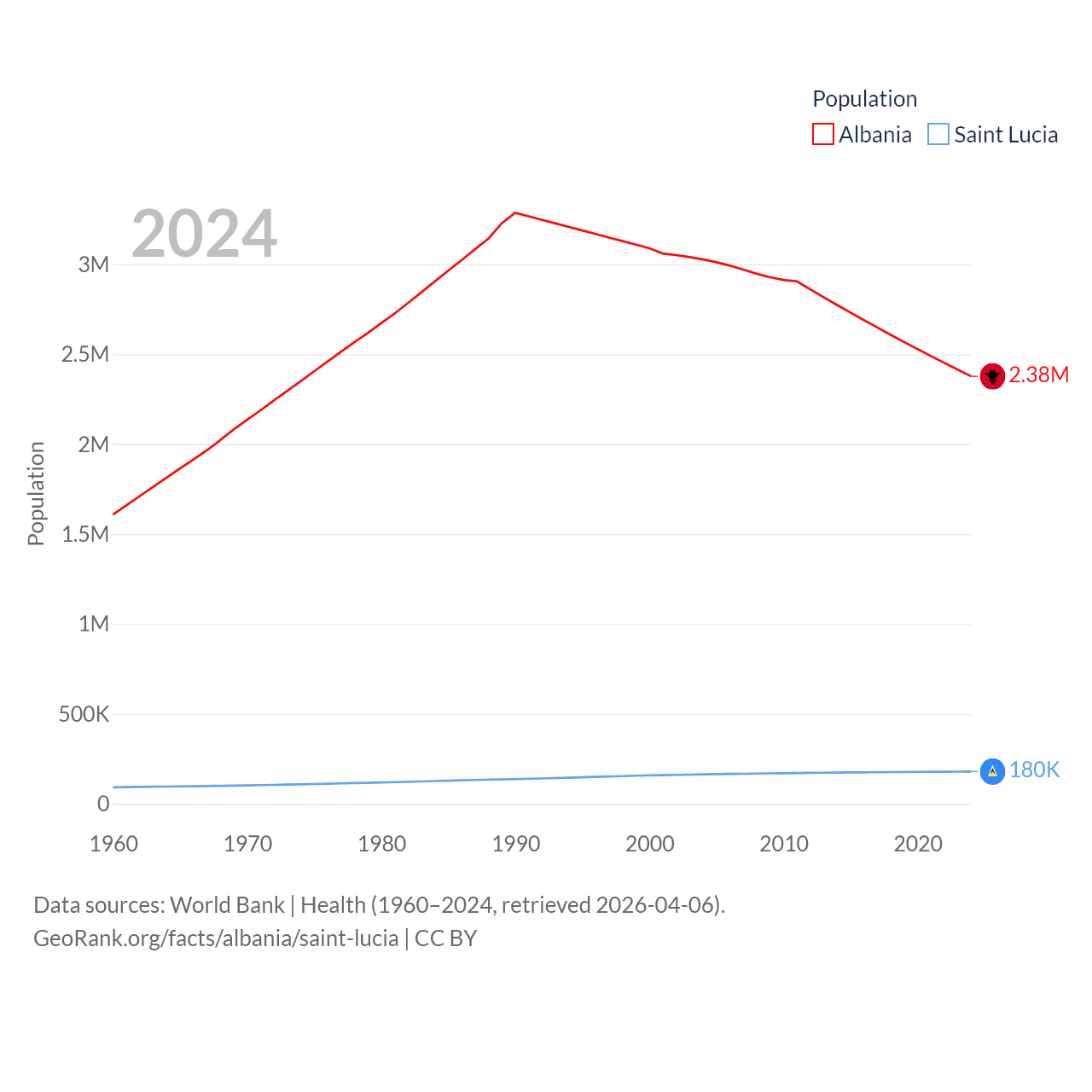 Albania has a population of 2.38M (ranked 144/197), compared with 180K in Saint Lucia (ranked 178/197). Albania's land area is 10,579 sq mi versus 235.5 sq mi for Saint Lucia (ranked 143rd vs. 178th).