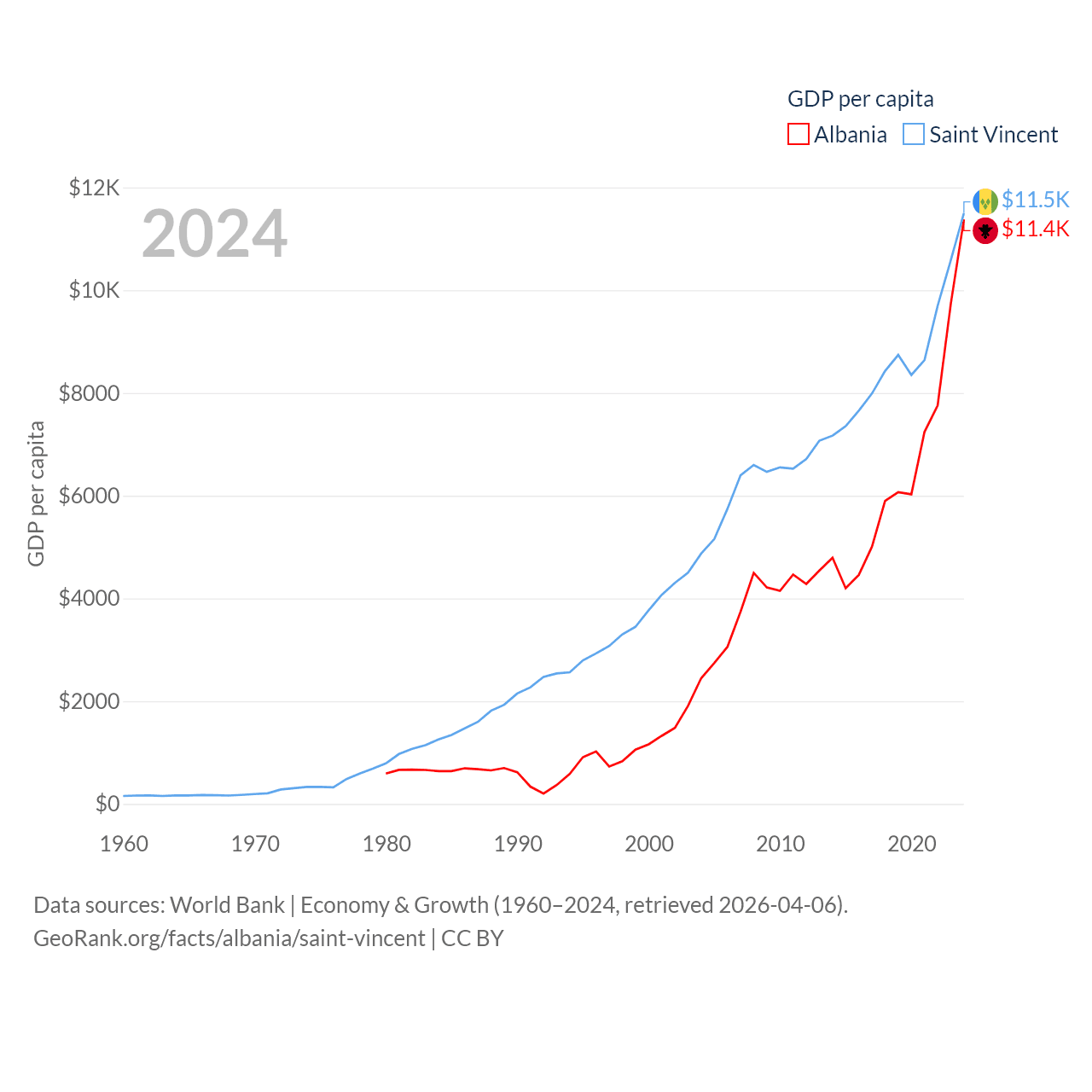 By GDP, Albania ranks 112/197 ($27B) and Saint Vincent ranks 186/197 ($1.16B). By GDP per capita, Albania ranks 82/197 ($11,378), while Saint Vincent ranks 81/197 ($11,501).