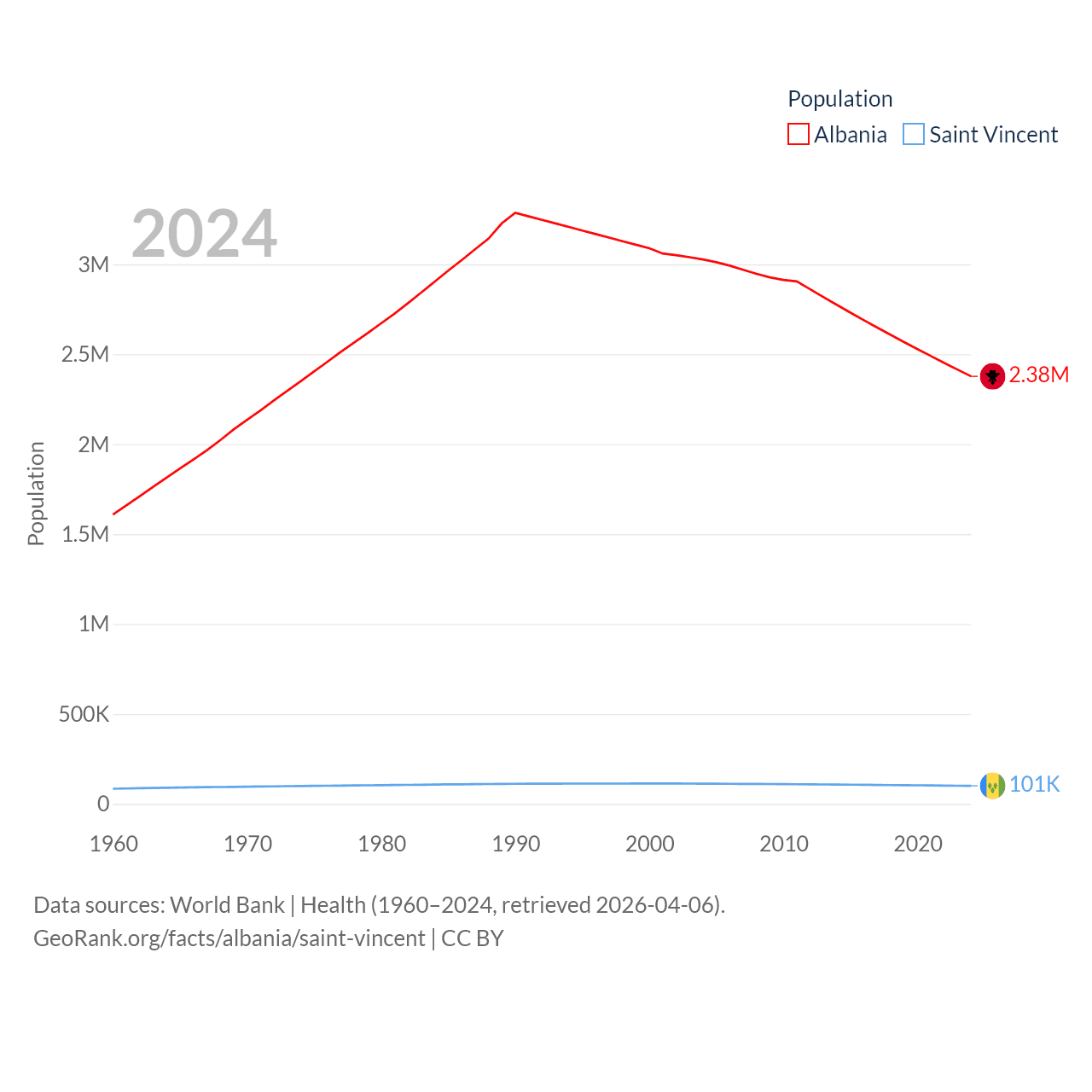 Albania has a population of 2.38M (ranked 144/197), compared with 101K in Saint Vincent (ranked 184/197). Albania's land area is 10,579 sq mi versus 150.6 sq mi for Saint Vincent (ranked 143rd vs. 185th).