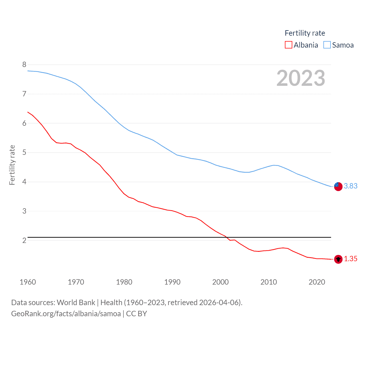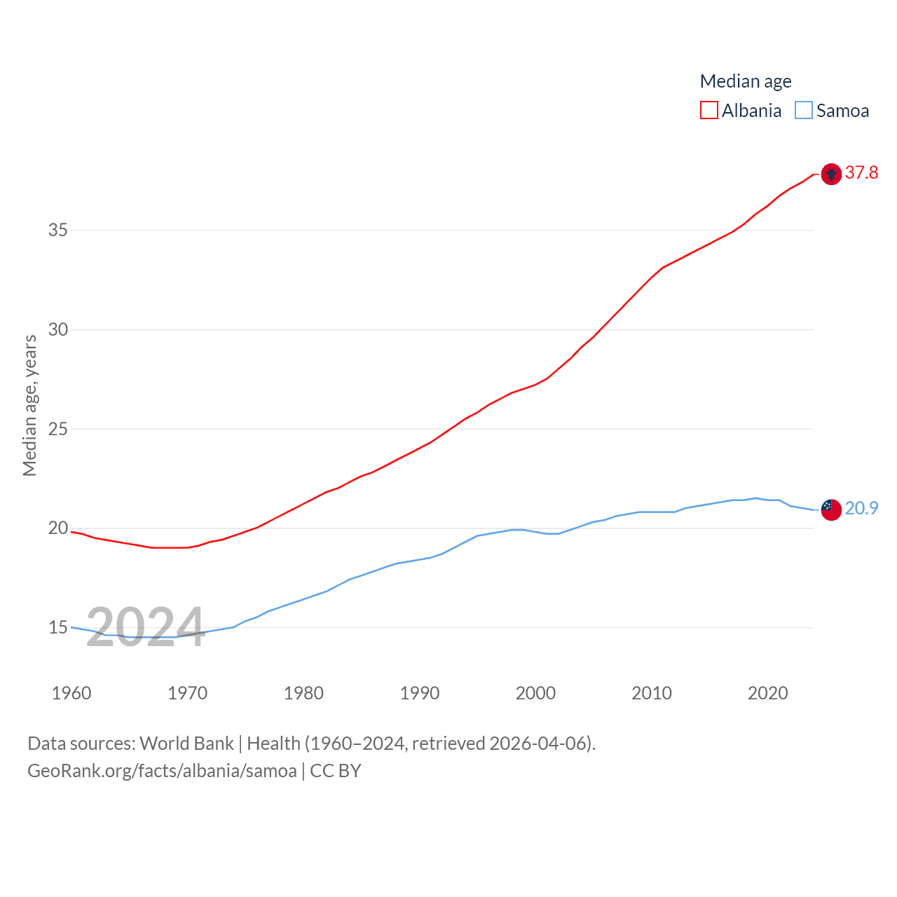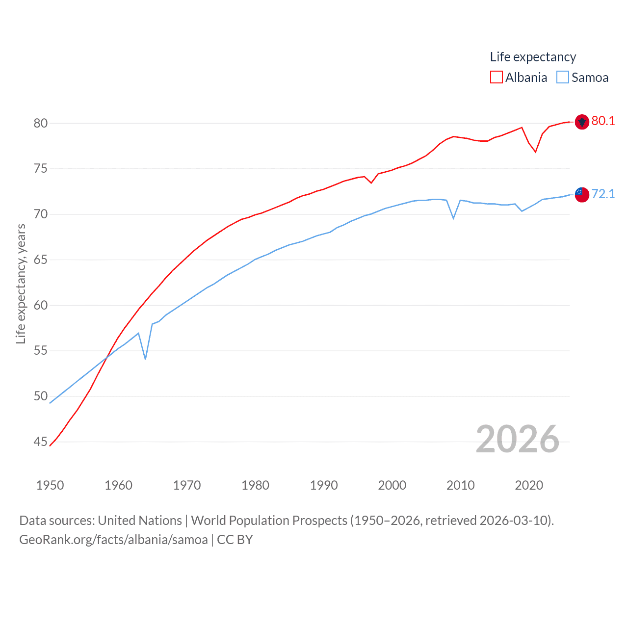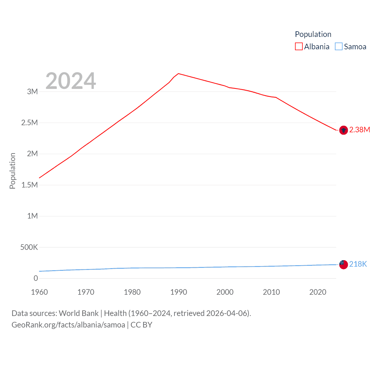 Albania has a population of 2.38M (ranked 144/197), compared with 218K in Samoa (ranked 177/197). Albania's land area is 10,579 sq mi versus 1,073 sq mi for Samoa (ranked 143rd vs. 168th).
