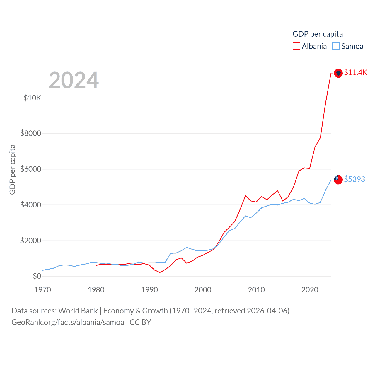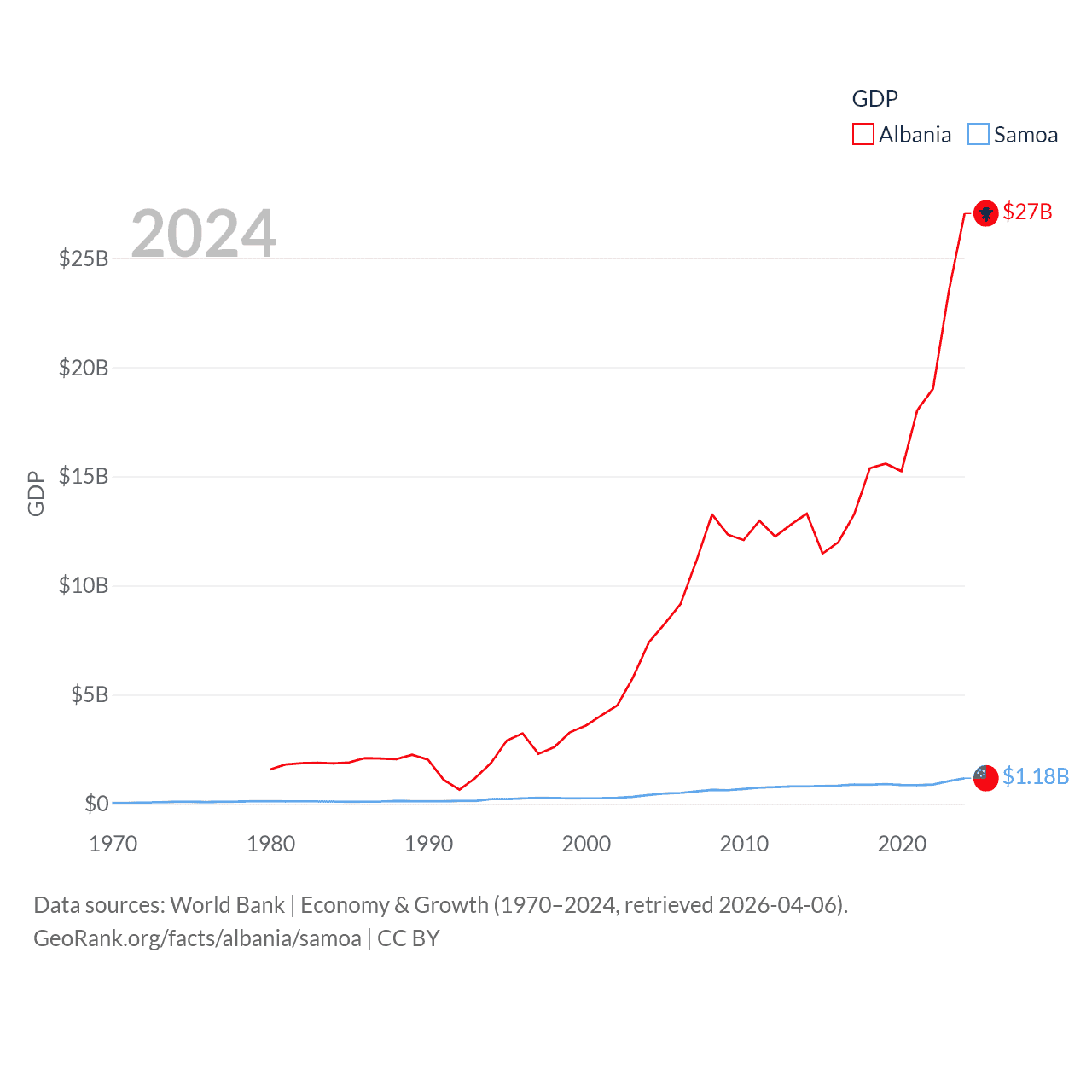 By GDP, Albania ranks 112/197 ($27B) and Samoa ranks 185/197 ($1.18B). By GDP per capita, Albania ranks 82/197 ($11,378), while Samoa ranks 117/197 ($5,393).