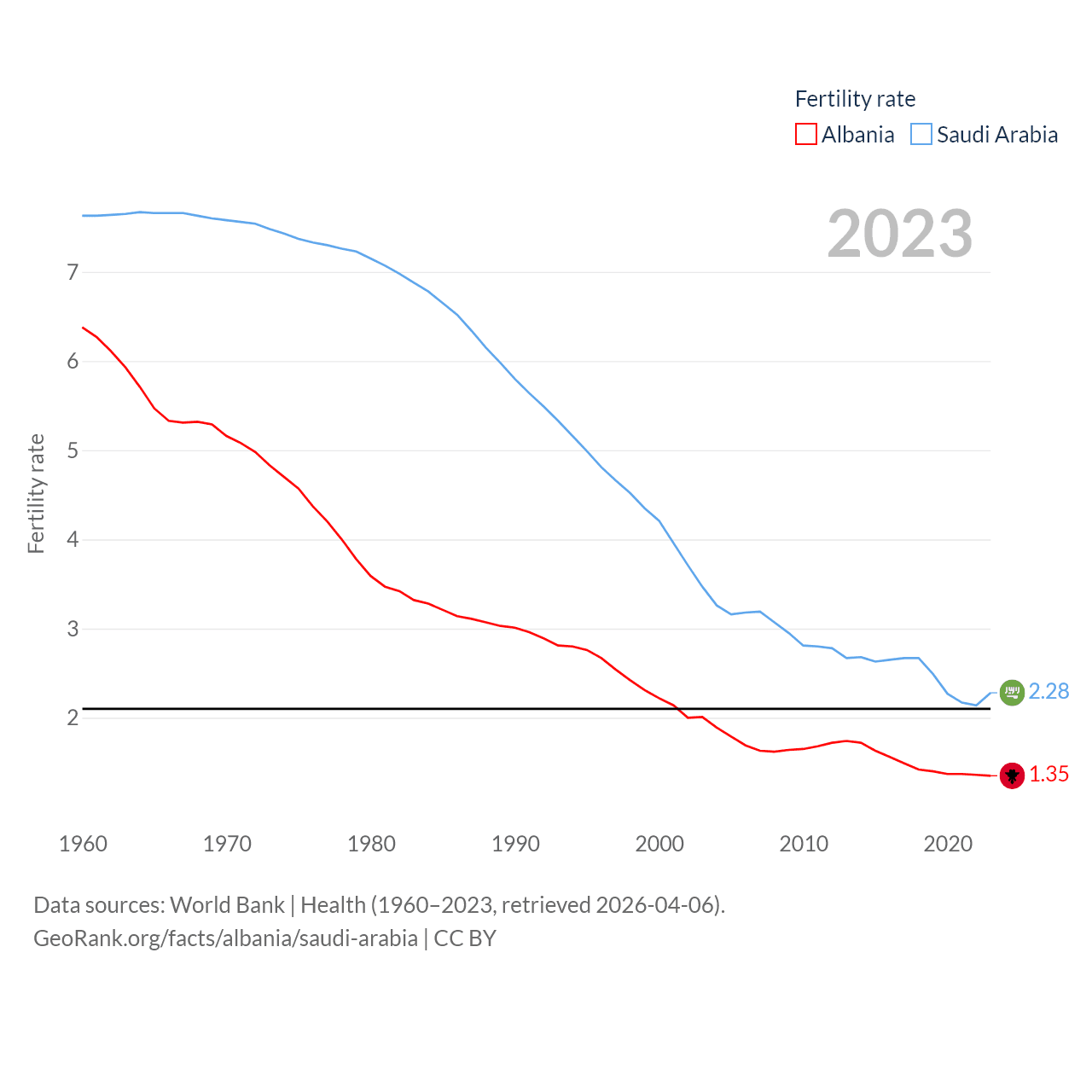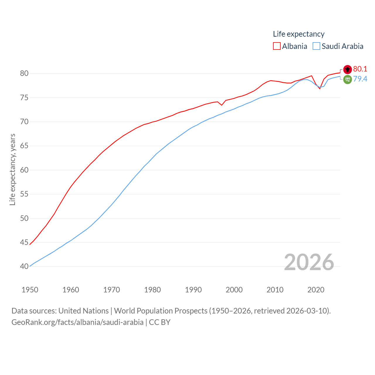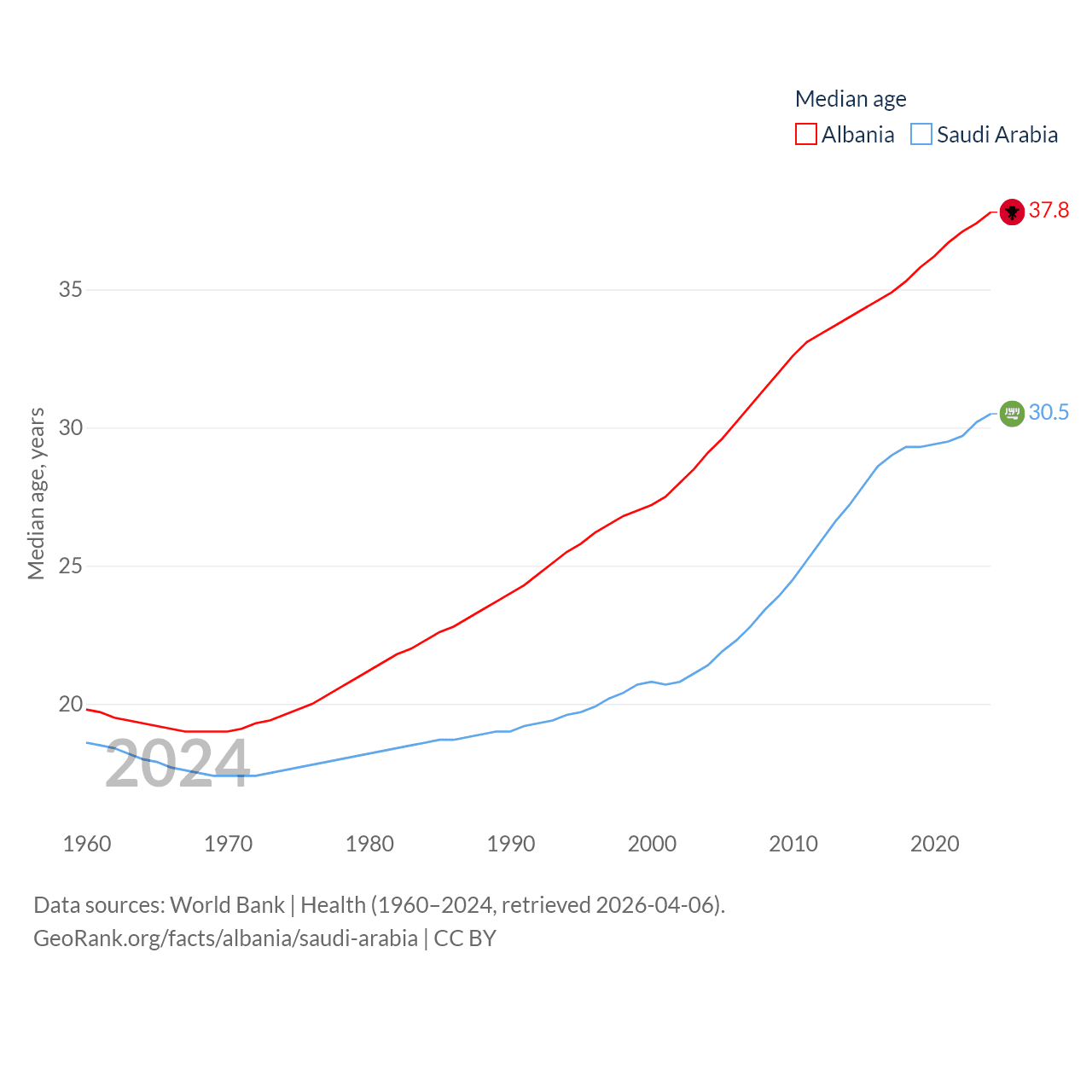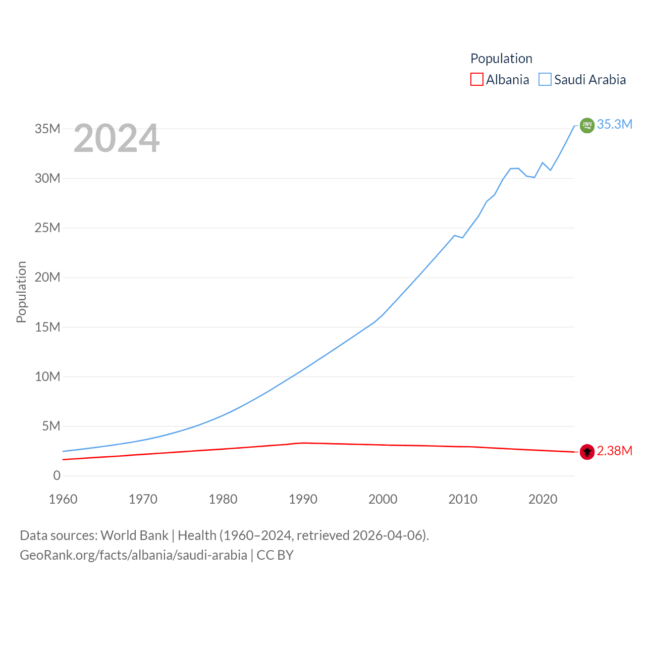 Albania has a population of 2.38M (ranked 144/197), compared with 35.3M in Saudi Arabia (ranked 45/197). Albania's land area is 10,579 sq mi versus 830,000 sq mi for Saudi Arabia (ranked 143rd vs. 12th).
