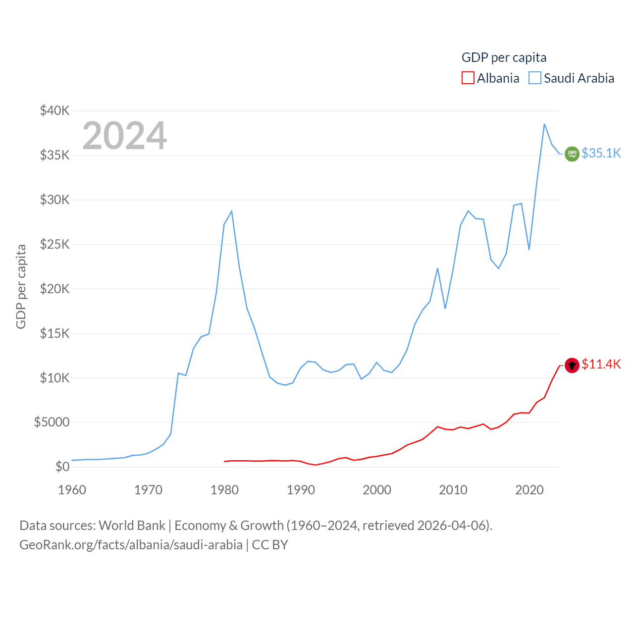 By GDP, Albania ranks 112/197 ($27B) and Saudi Arabia ranks 18/197 ($1.24T). By GDP per capita, Albania ranks 82/197 ($11,378), while Saudi Arabia ranks 33/197 ($35,122).