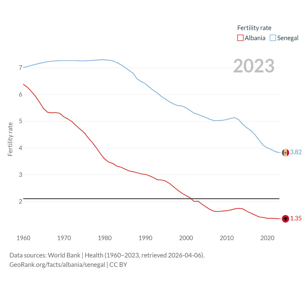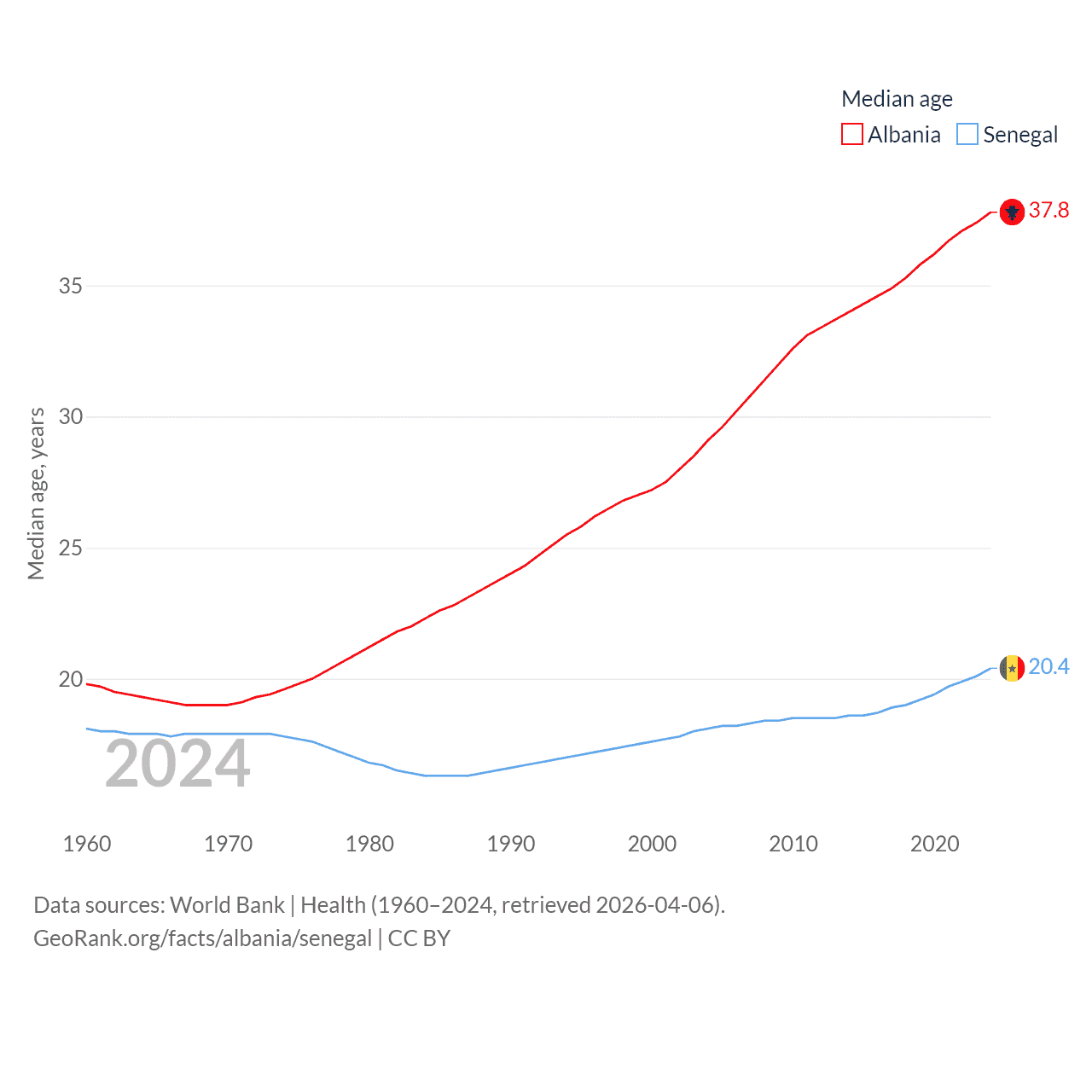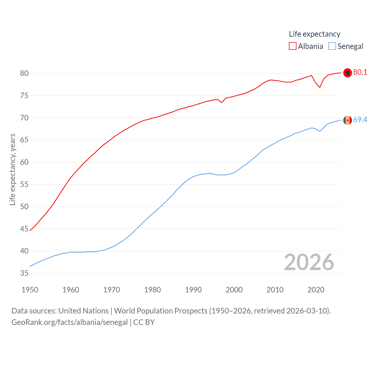 Albania has a population of 2.38M (ranked 144/197), compared with 18.5M in Senegal (ranked 69/197). Albania's land area is 10,579 sq mi versus 74,336 sq mi for Senegal (ranked 143rd vs. 85th).
