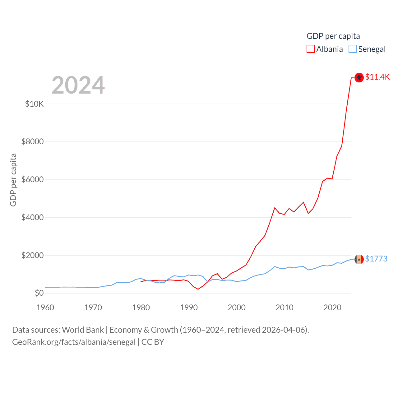 By GDP, Albania ranks 112/197 ($27B) and Senegal ranks 109/197 ($32.8B). By GDP per capita, Albania ranks 82/197 ($11,378), while Senegal ranks 159/197 ($1,773).