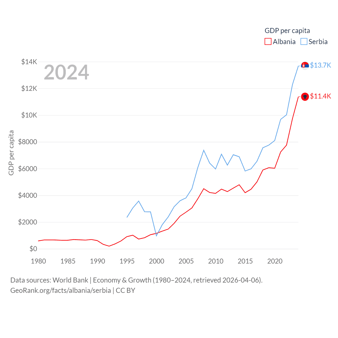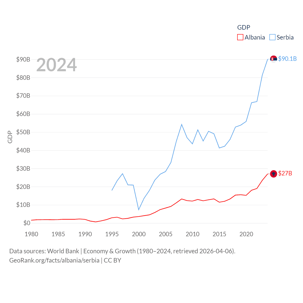 By GDP, Albania ranks 112/197 ($27B) and Serbia ranks 76/197 ($90.1B). By GDP per capita, Albania ranks 82/197 ($11,378), while Serbia ranks 73/197 ($13,679).