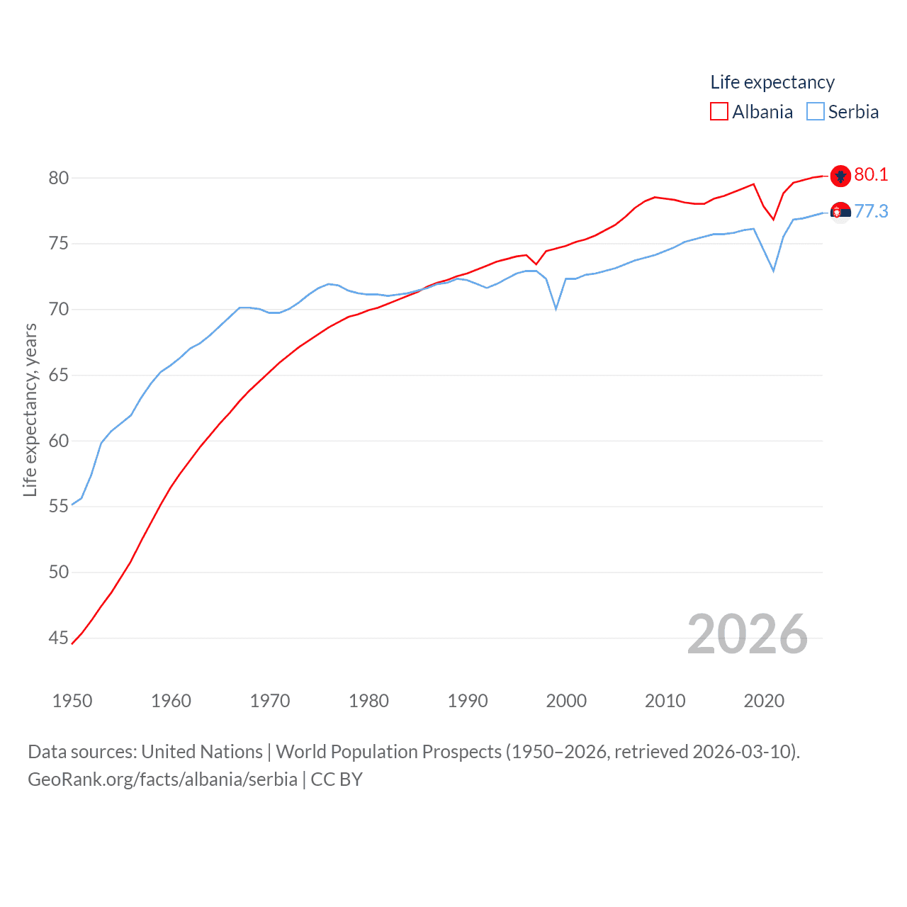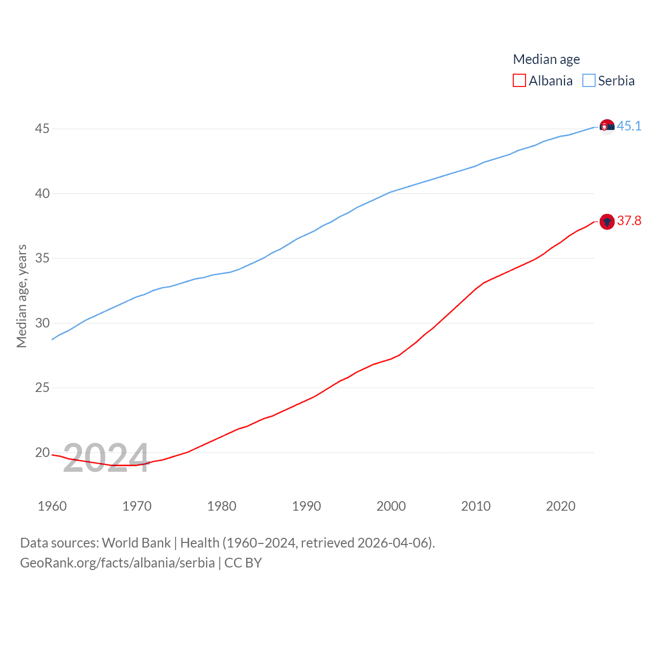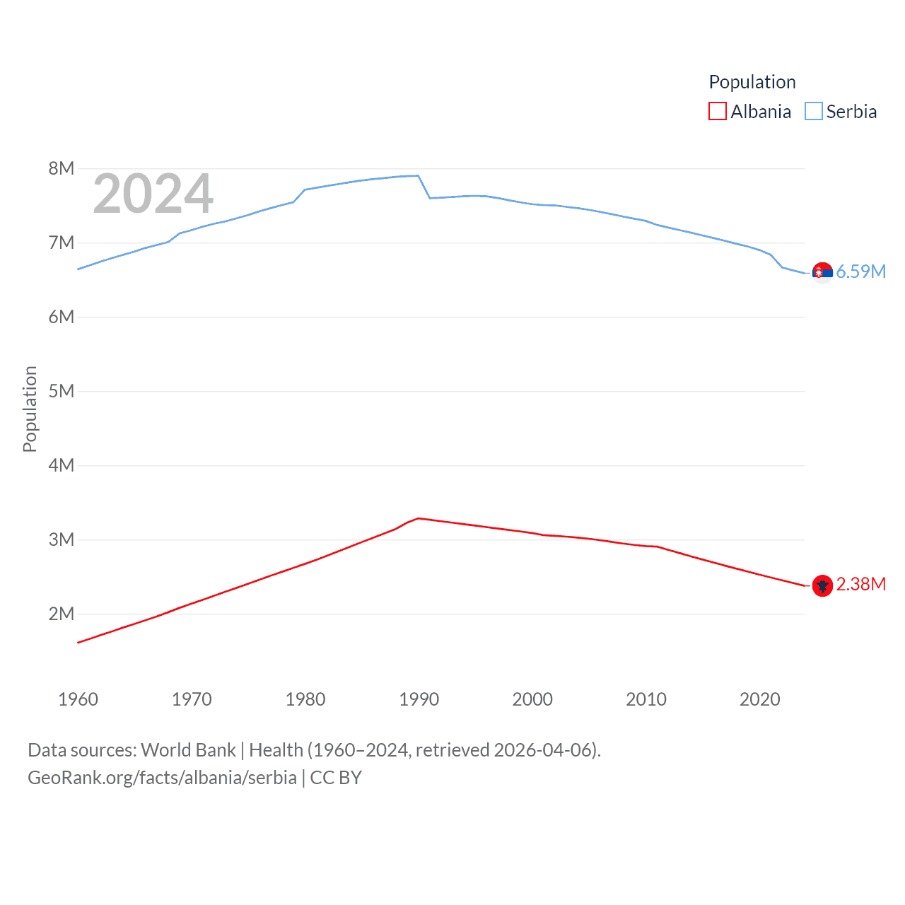 Albania has a population of 2.38M (ranked 144/197), compared with 6.59M in Serbia (ranked 109/197). Albania's land area is 10,579 sq mi versus 32,467 sq mi for Serbia (ranked 143rd vs. 111th).