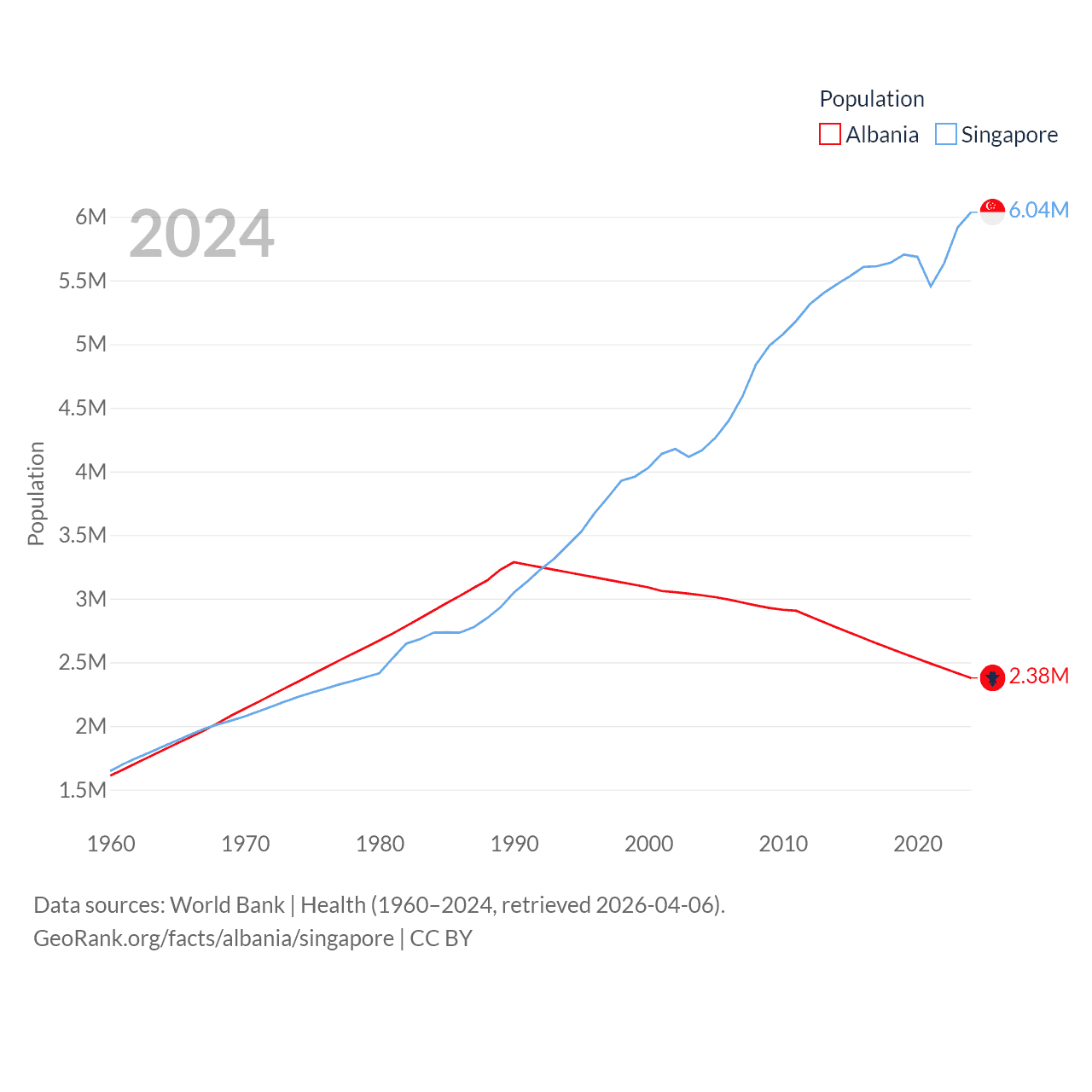 Albania has a population of 2.38M (ranked 144/197), compared with 6.04M in Singapore (ranked 113/197). Albania's land area is 10,579 sq mi versus 277.2 sq mi for Singapore (ranked 143rd vs. 177th).