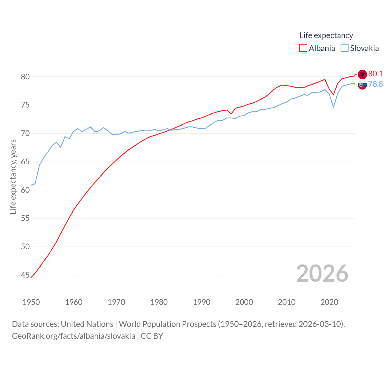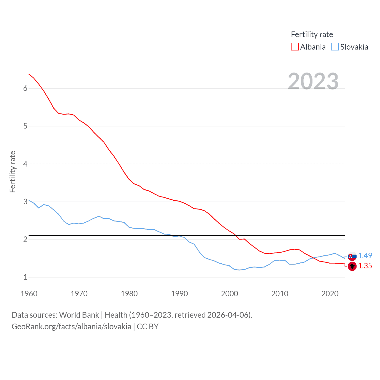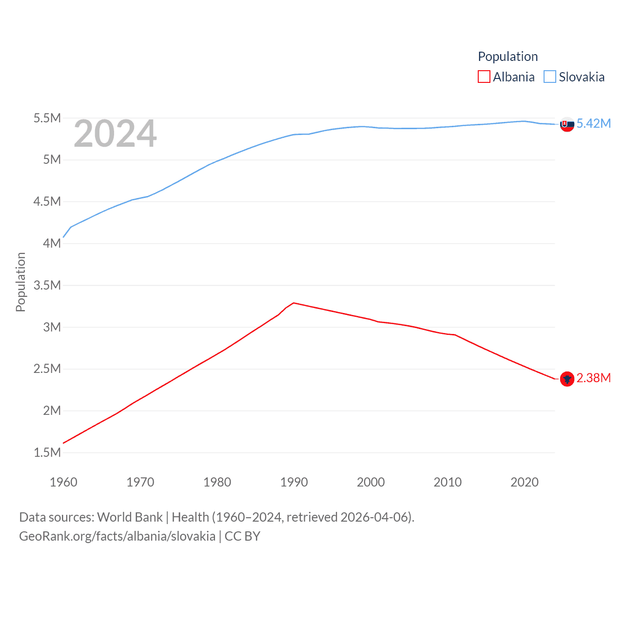 Albania has a population of 2.38M (ranked 144/197), compared with 5.42M in Slovakia (ranked 119/197). Albania's land area is 10,579 sq mi versus 18,564 sq mi for Slovakia (ranked 143rd vs. 128th).