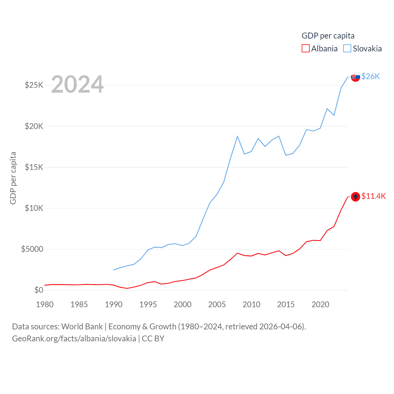 By GDP, Albania ranks 112/197 ($27B) and Slovakia ranks 61/197 ($141B). By GDP per capita, Albania ranks 82/197 ($11,378), while Slovakia ranks 47/197 ($25,993).