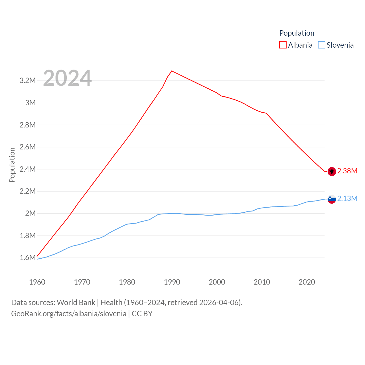 Albania has a population of 2.38M (ranked 144/197), compared with 2.13M in Slovenia (ranked 147/197). Albania's land area is 10,579 sq mi versus 7,774 sq mi for Slovenia (ranked 143rd vs. 151st).