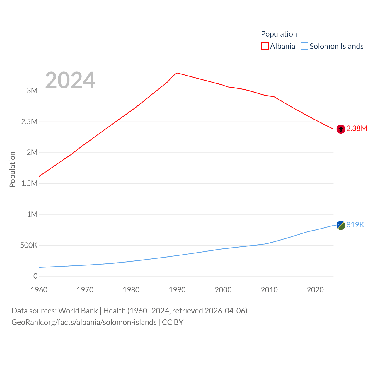 Albania has a population of 2.38M (ranked 144/197), compared with 819K in The Solomon Islands (ranked 162/197). Albania's land area is 10,579 sq mi versus 10,807 sq mi for The Solomon Islands (ranked 143rd vs. 141st).