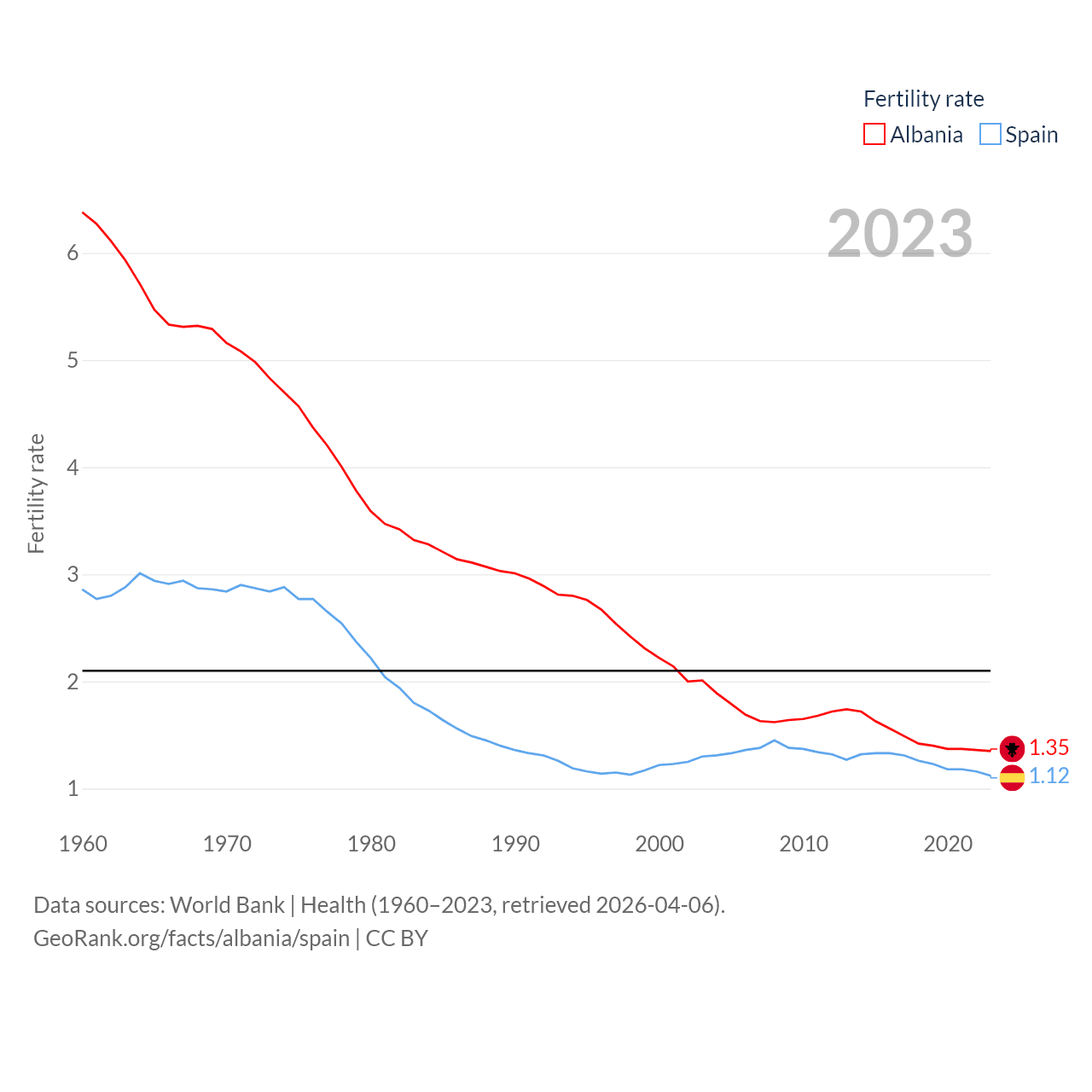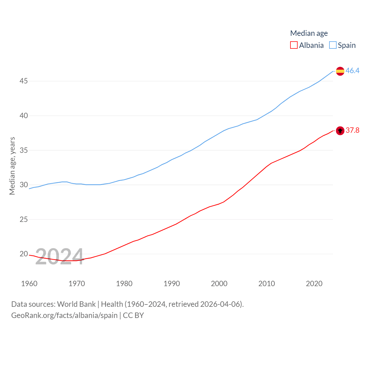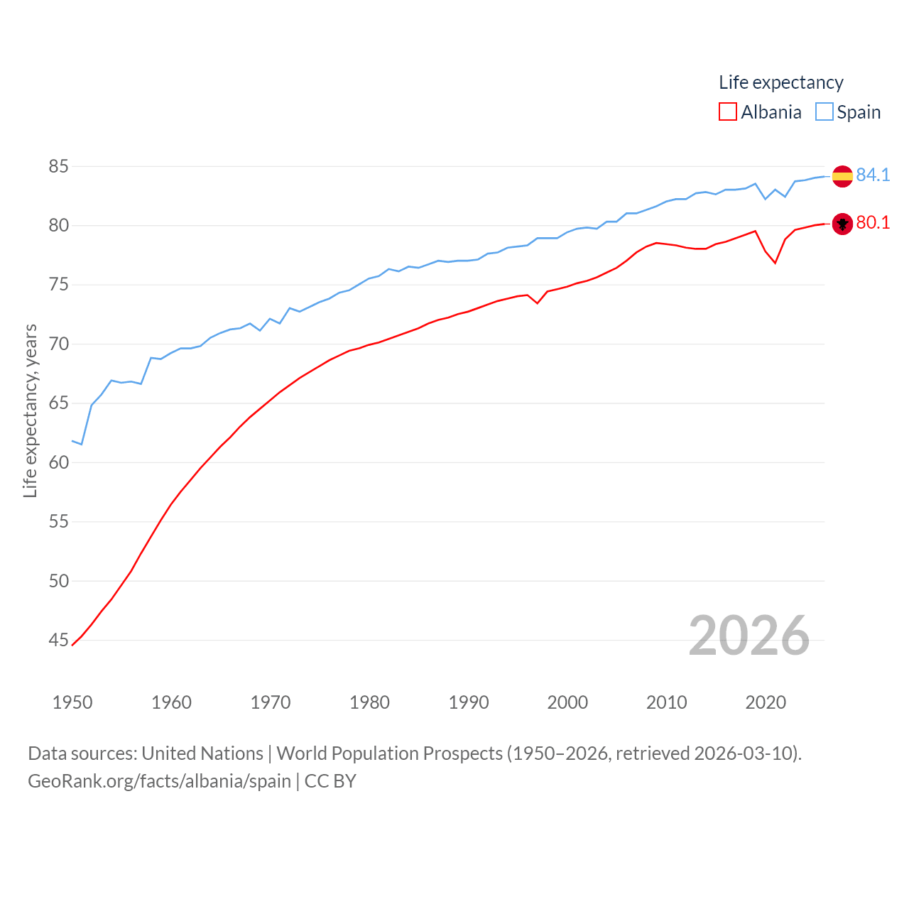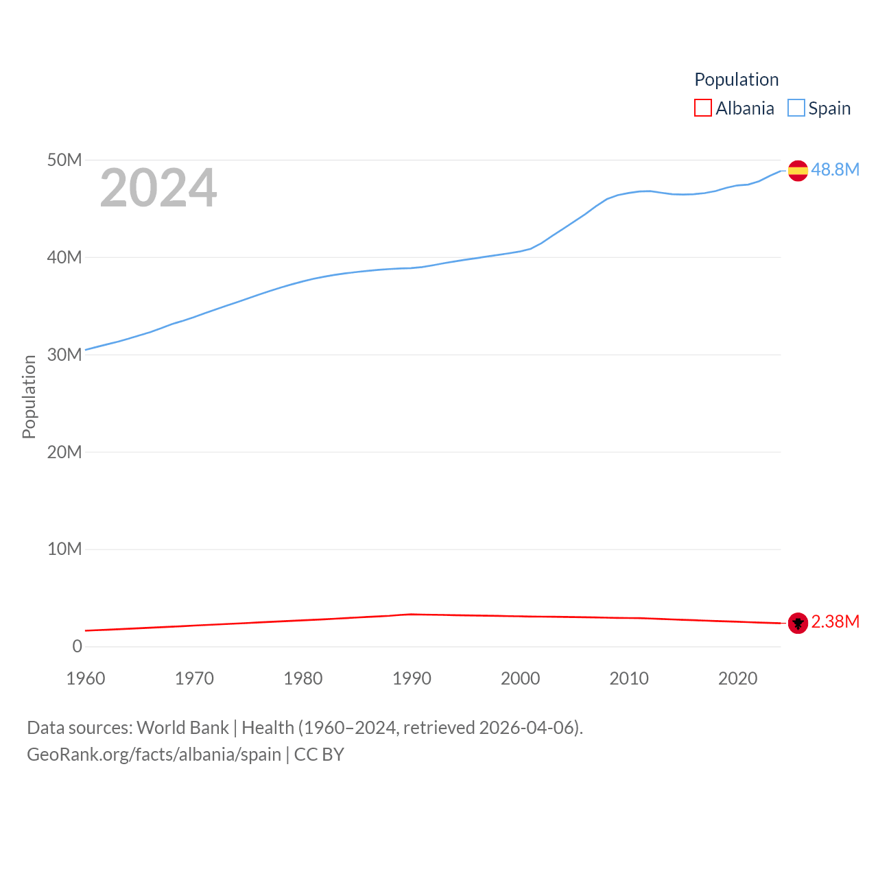 Albania has a population of 2.38M (ranked 144/197), compared with 48.8M in Spain (ranked 32/197). Albania's land area is 10,579 sq mi versus 192,934 sq mi for Spain (ranked 143rd vs. 51st).