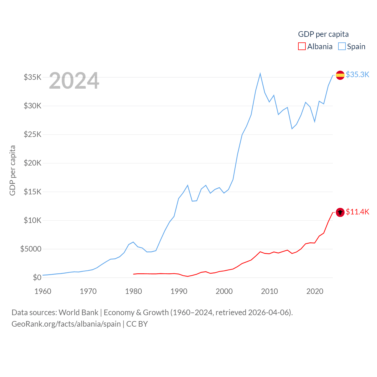 By GDP, Albania ranks 112/197 ($27B) and Spain ranks 15/197 ($1.73T). By GDP per capita, Albania ranks 82/197 ($11,378), while Spain ranks 32/197 ($35,327).