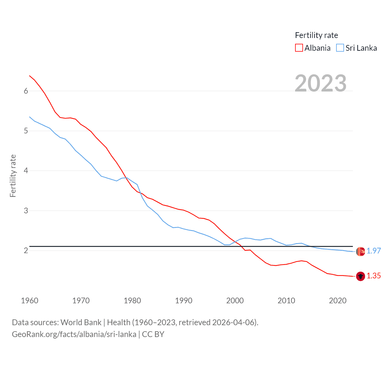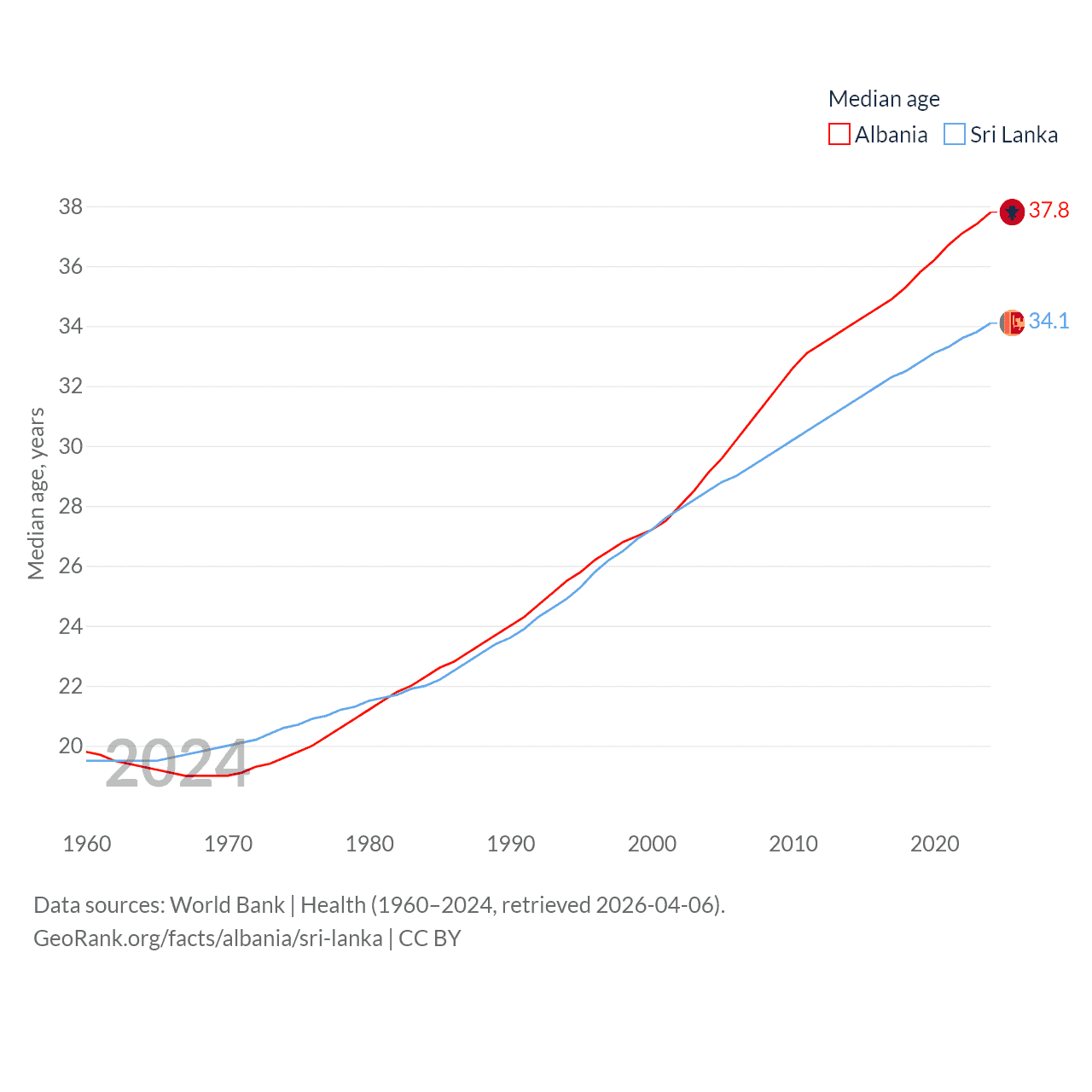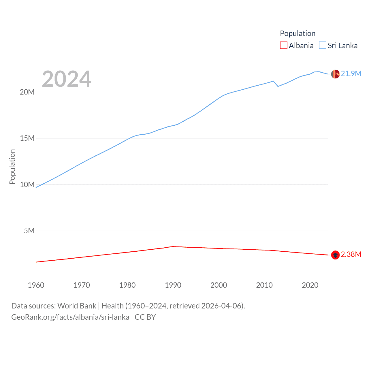 Albania has a population of 2.38M (ranked 144/197), compared with 21.9M in Sri Lanka (ranked 61/197). Albania's land area is 10,579 sq mi versus 23,884 sq mi for Sri Lanka (ranked 143rd vs. 122nd).
