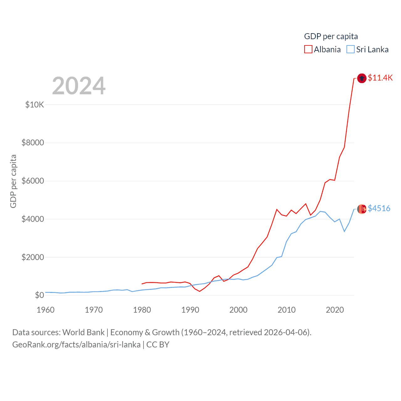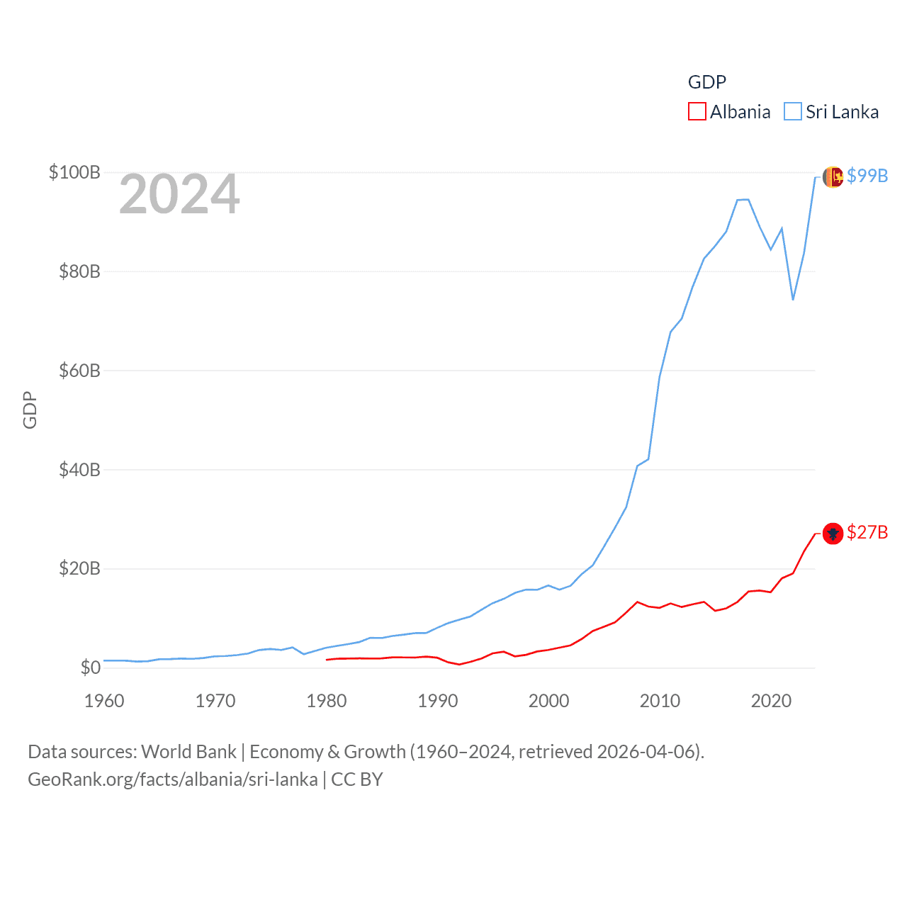 By GDP, Albania ranks 112/197 ($27B) and Sri Lanka ranks 72/197 ($99B). By GDP per capita, Albania ranks 82/197 ($11,378), while Sri Lanka ranks 124/197 ($4,516).