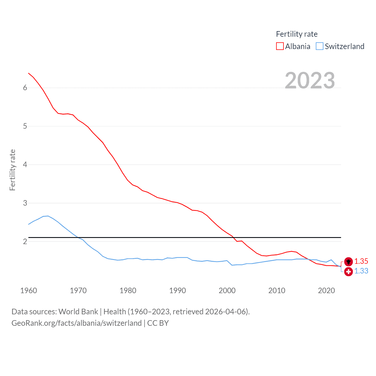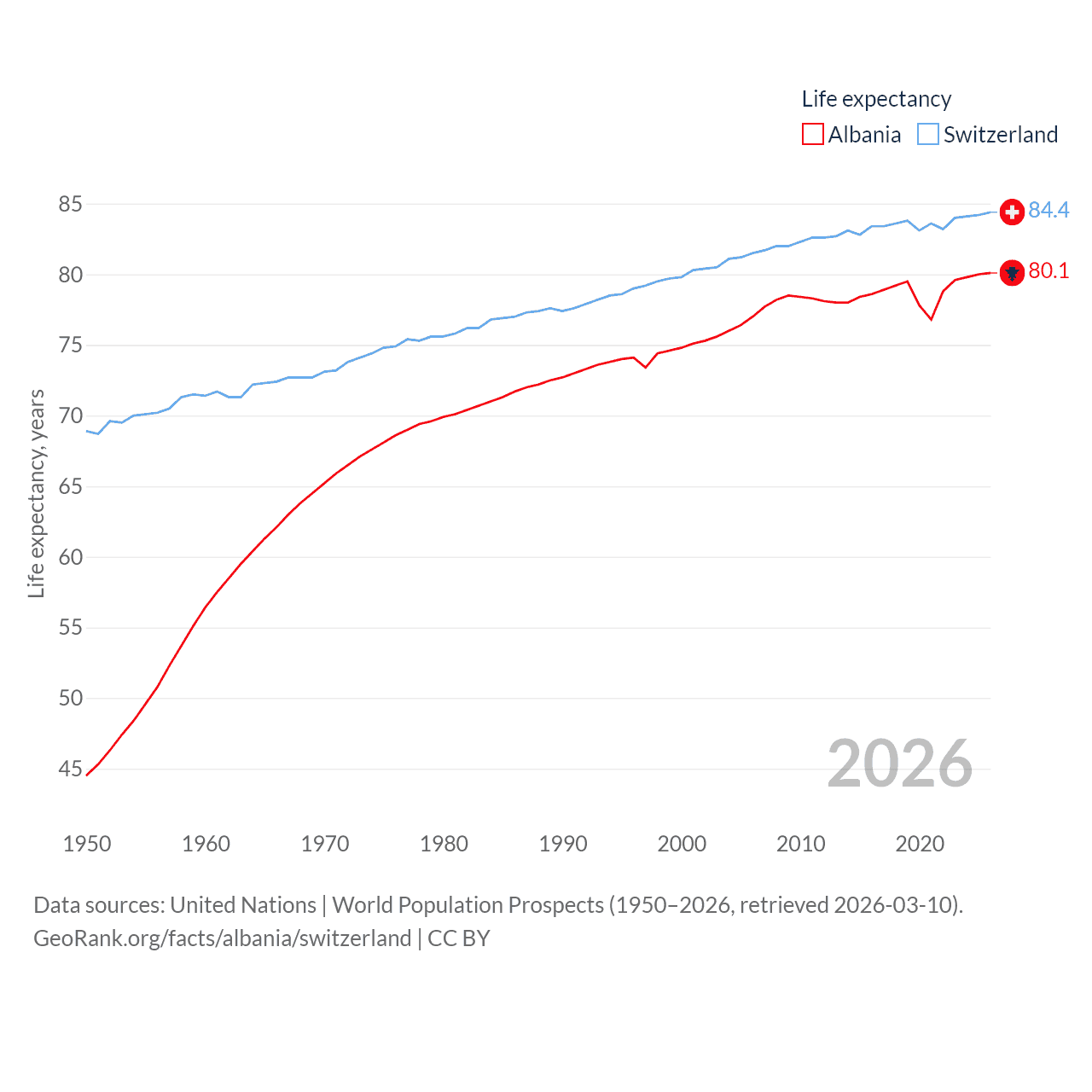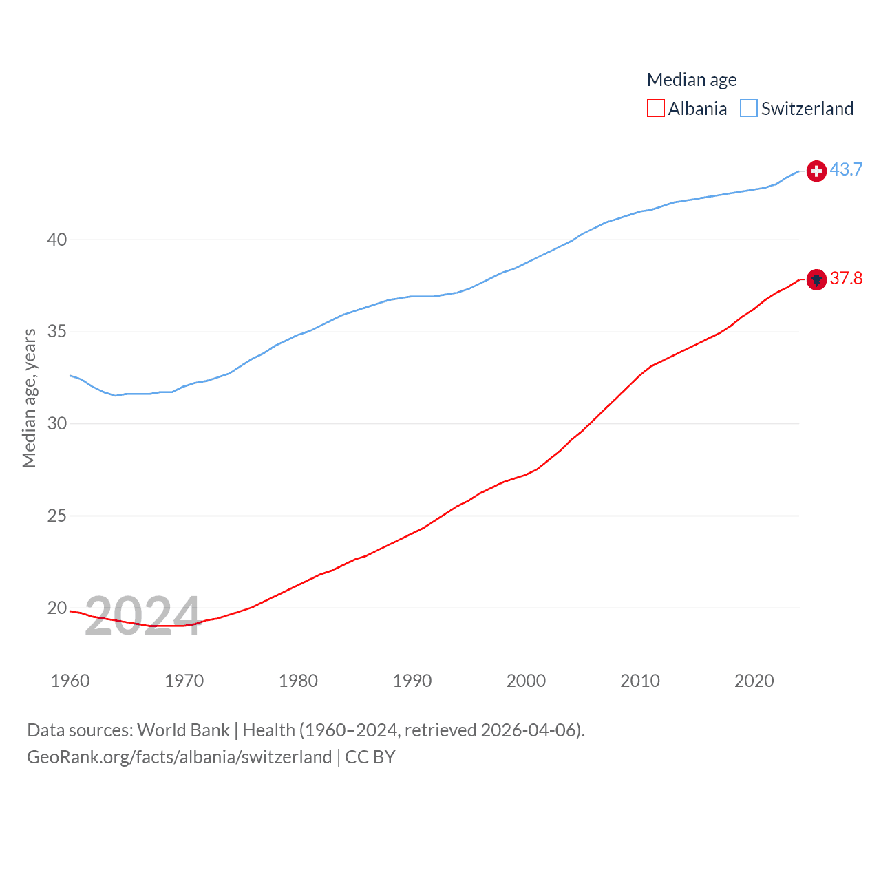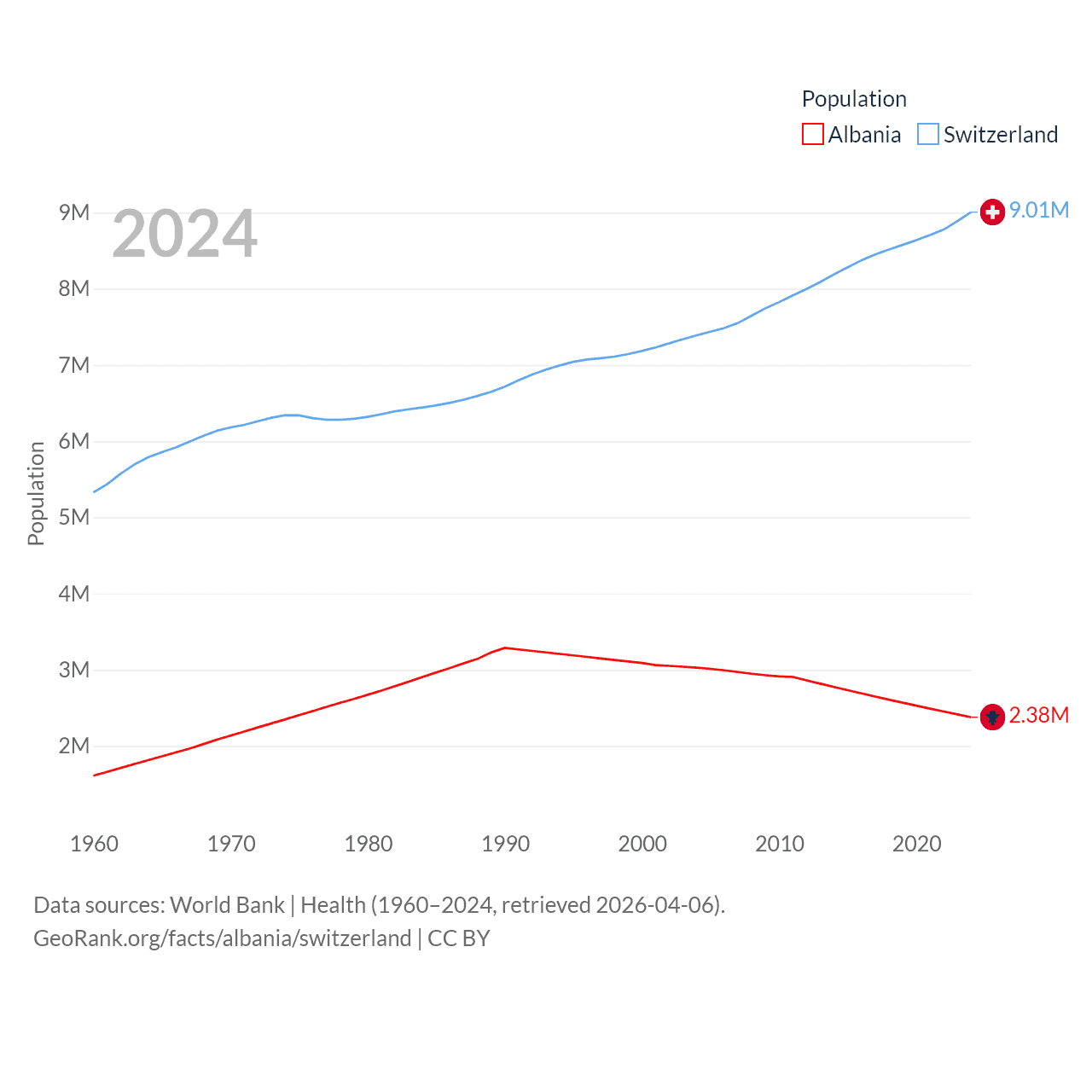 Albania has a population of 2.38M (ranked 144/197), compared with 9.01M in Switzerland (ranked 101/197). Albania's land area is 10,579 sq mi versus 15,255 sq mi for Switzerland (ranked 143rd vs. 131st).