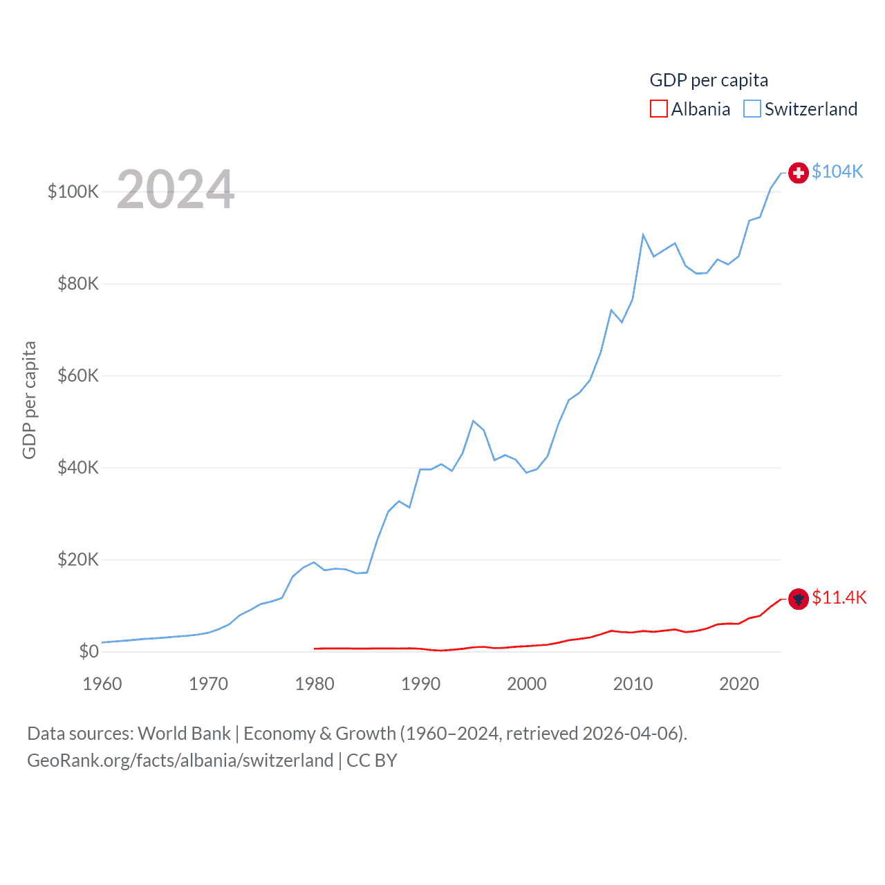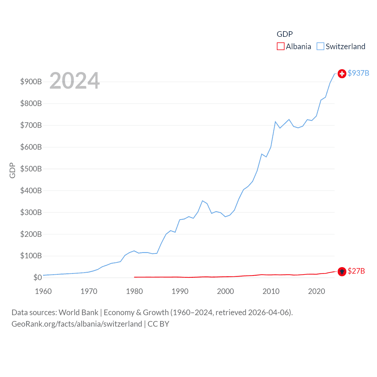 By GDP, Albania ranks 112/197 ($27B) and Switzerland ranks 20/197 ($937B). By GDP per capita, Albania ranks 82/197 ($11,378), while Switzerland ranks 5/197 ($103,998).