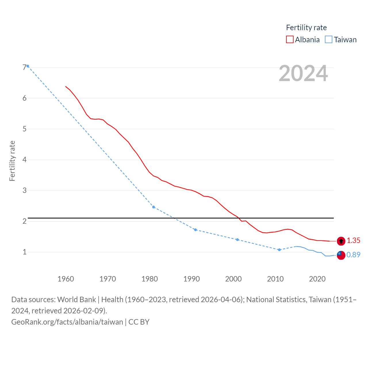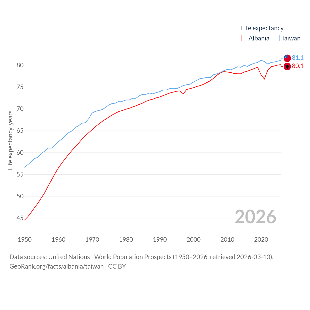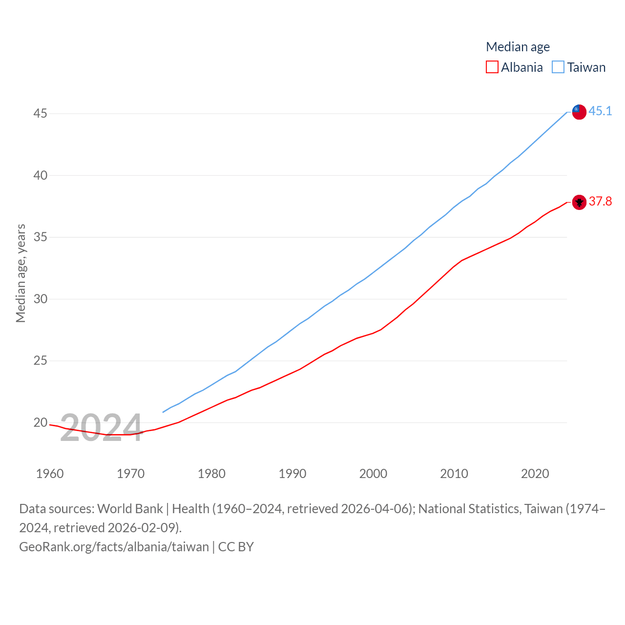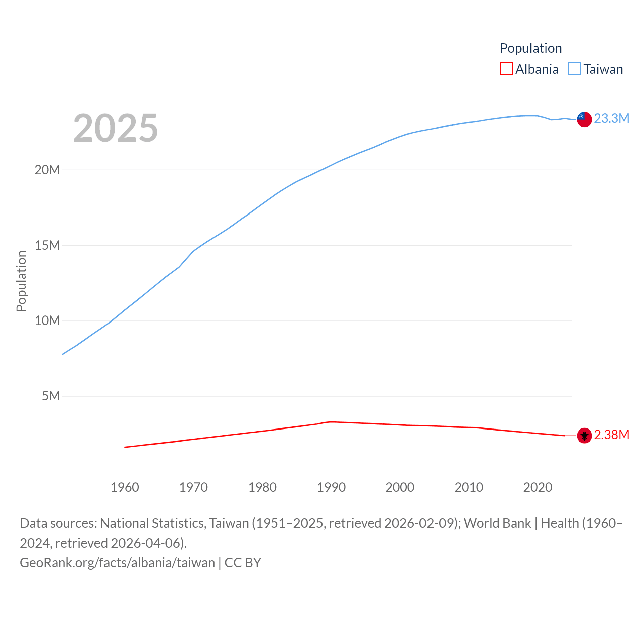 Albania has a population of 2.38M (ranked 144/197), compared with 23.3M in Taiwan (ranked 60/197). Albania's land area is 10,579 sq mi versus 13,976 sq mi for Taiwan (ranked 143rd vs. 133rd).