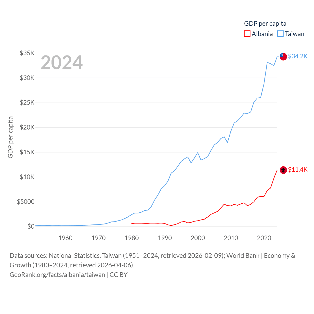 By GDP, Albania ranks 112/197 ($27B) and Taiwan ranks 22/197 ($802B). By GDP per capita, Albania ranks 82/197 ($11,378), while Taiwan ranks 35/197 ($34,238).