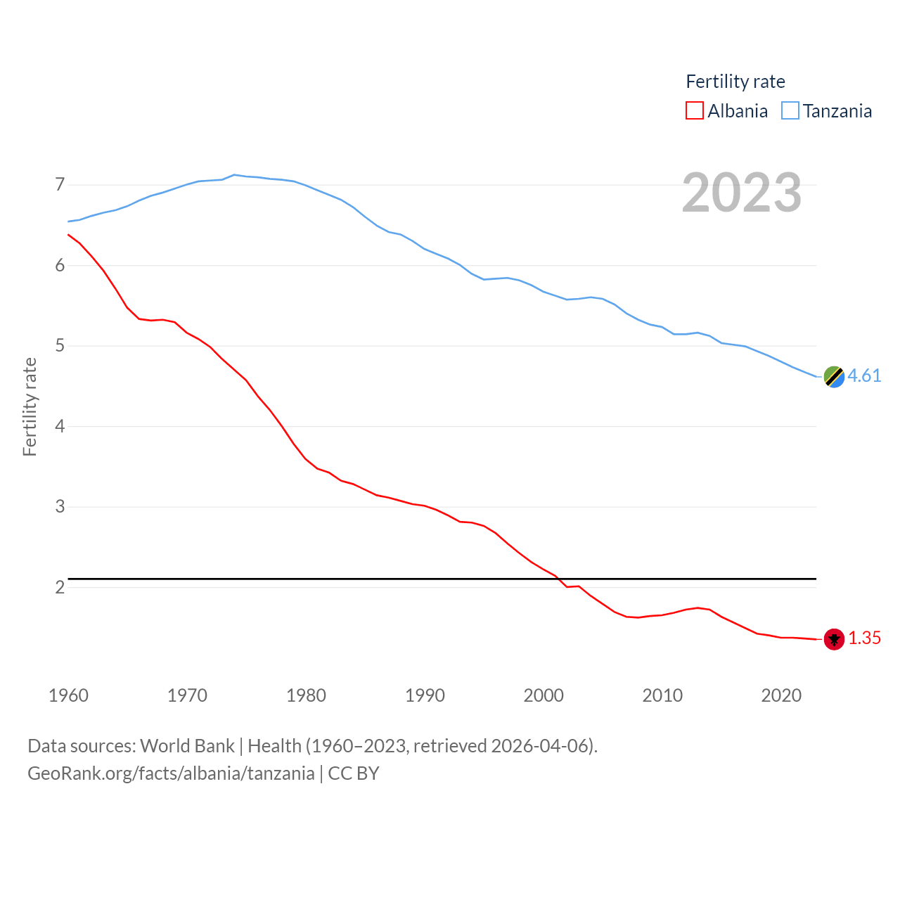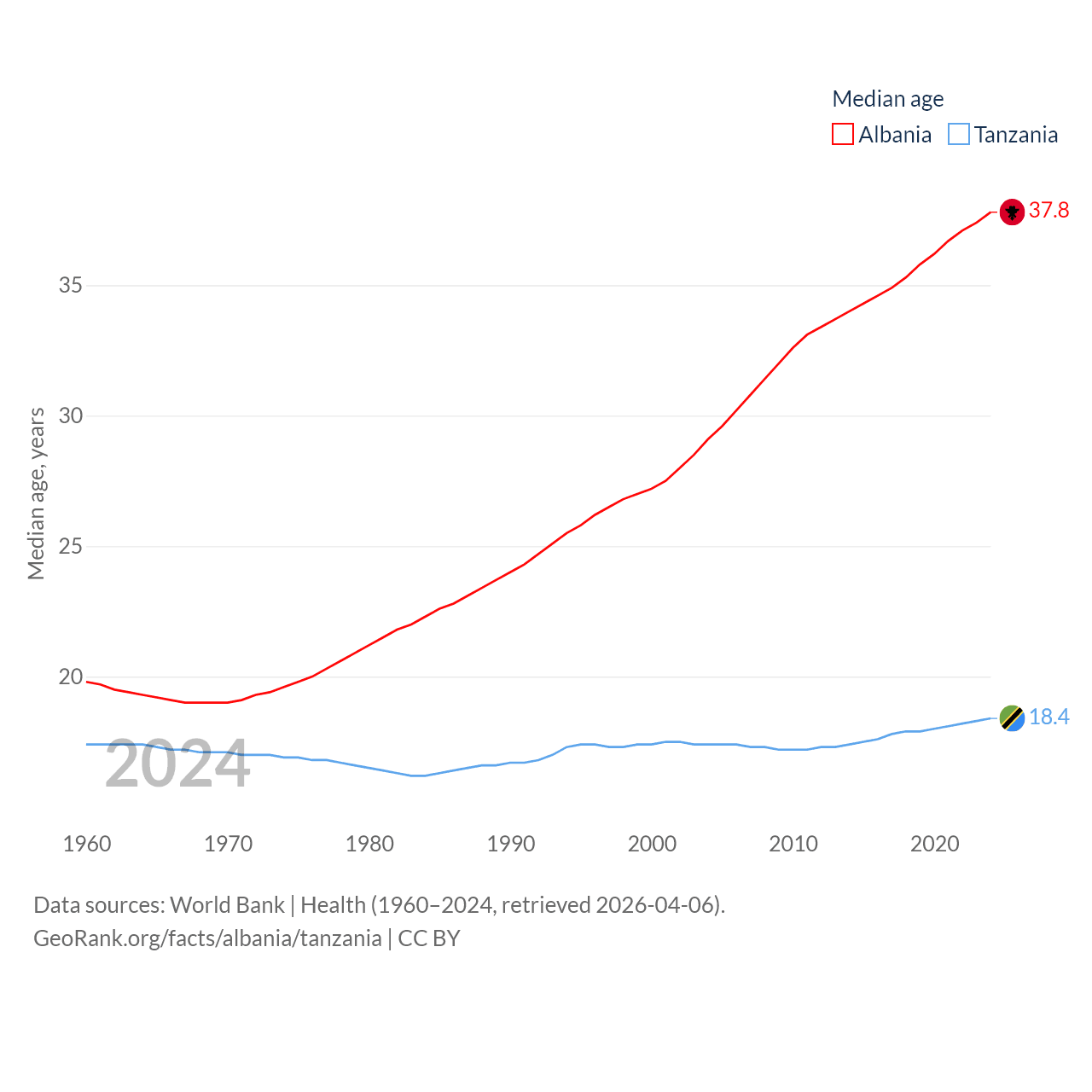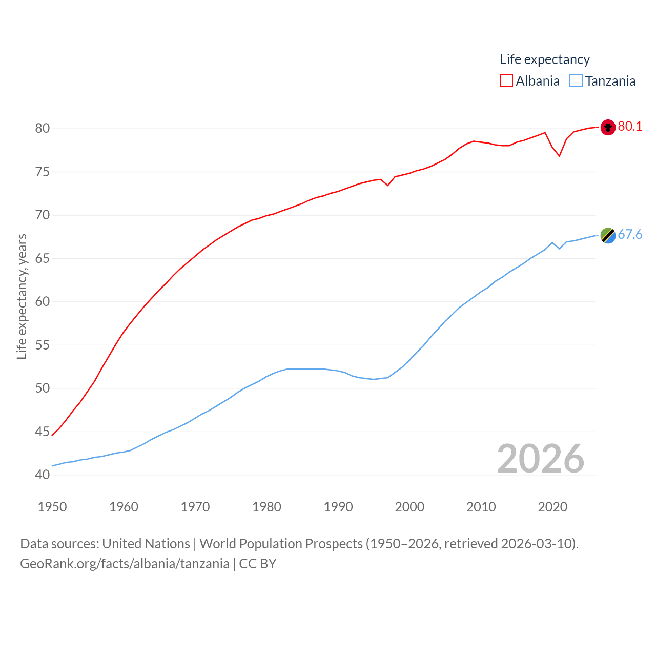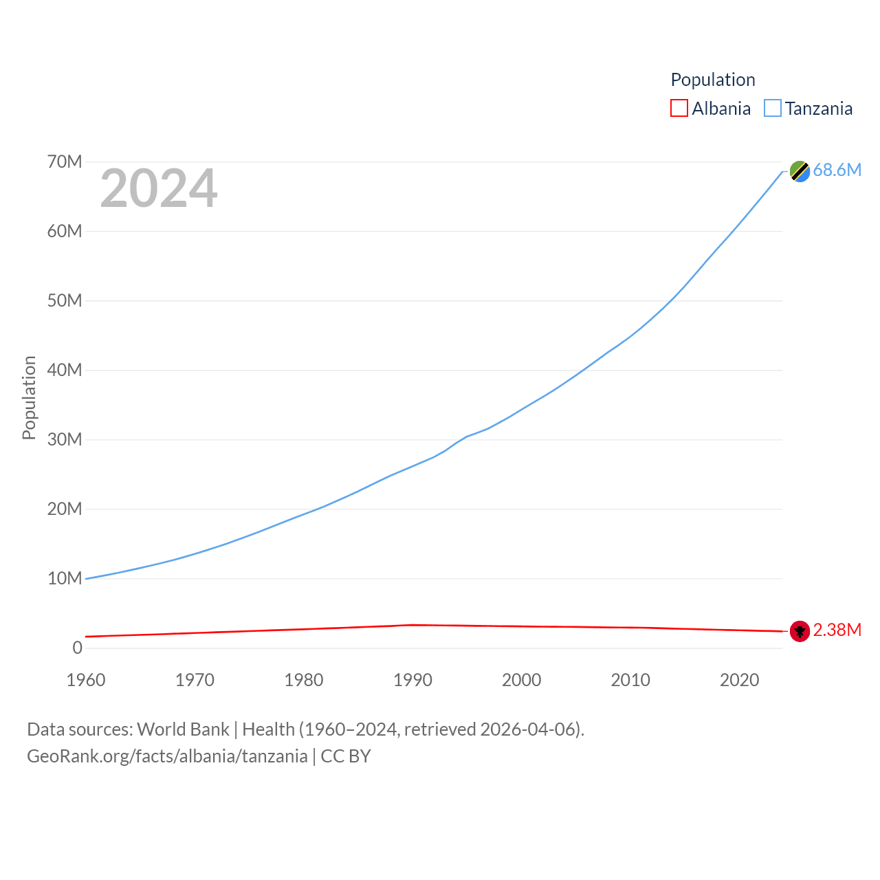 Albania has a population of 2.38M (ranked 144/197), compared with 68.6M in Tanzania (ranked 22/197). Albania's land area is 10,579 sq mi versus 342,009 sq mi for Tanzania (ranked 143rd vs. 31st).