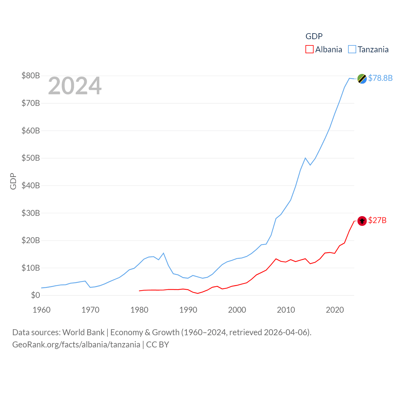 By GDP, Albania ranks 112/197 ($27B) and Tanzania ranks 82/197 ($78.8B). By GDP per capita, Albania ranks 82/197 ($11,378), while Tanzania ranks 170/197 ($1,150).