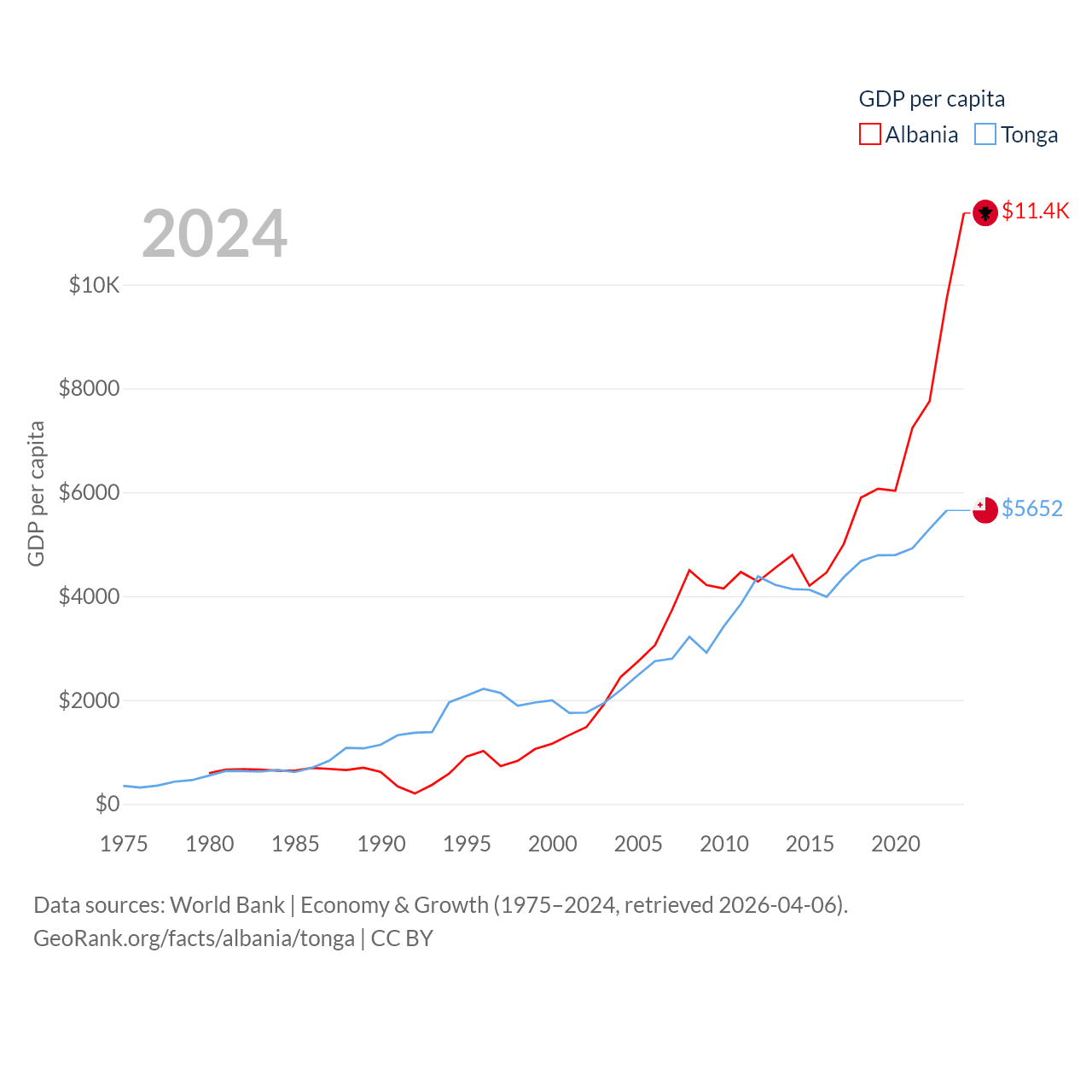 By GDP, Albania ranks 112/197 ($27B) and Tonga ranks 191/197 ($591M). By GDP per capita, Albania ranks 82/197 ($11,378), while Tonga ranks 115/197 ($5,652).
