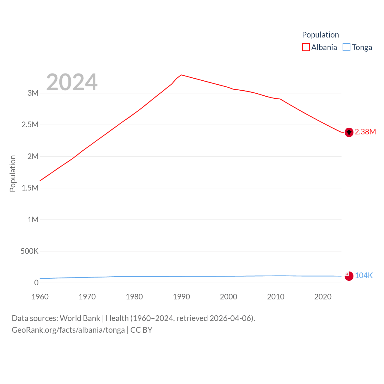 Albania has a population of 2.38M (ranked 144/197), compared with 104K in Tonga (ranked 183/197). Albania's land area is 10,579 sq mi versus 278 sq mi for Tonga (ranked 143rd vs. 176th).