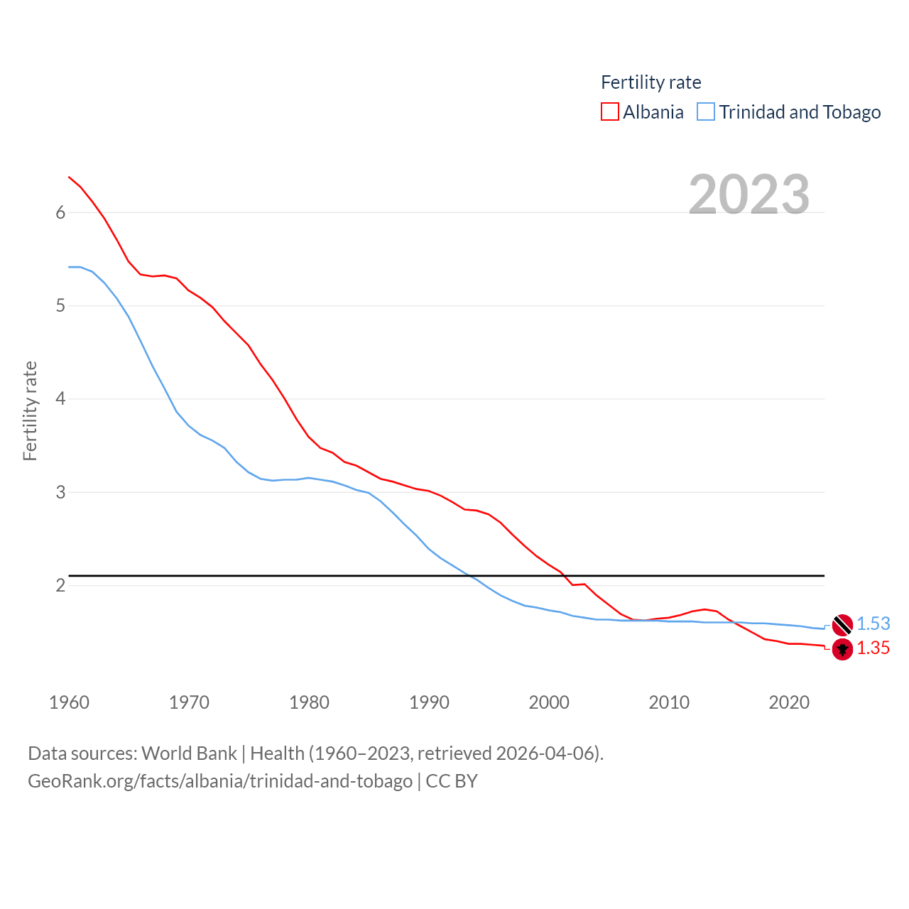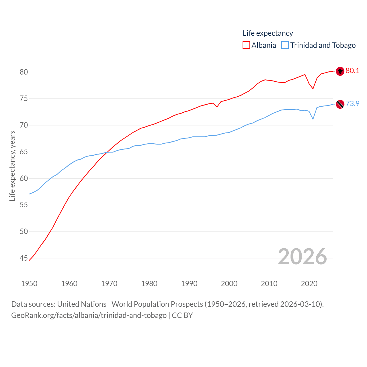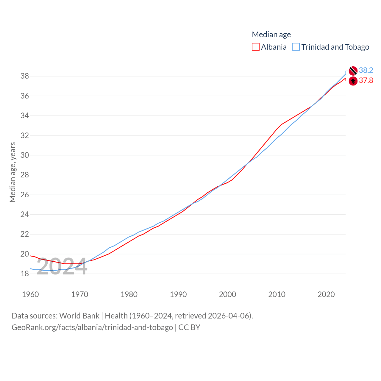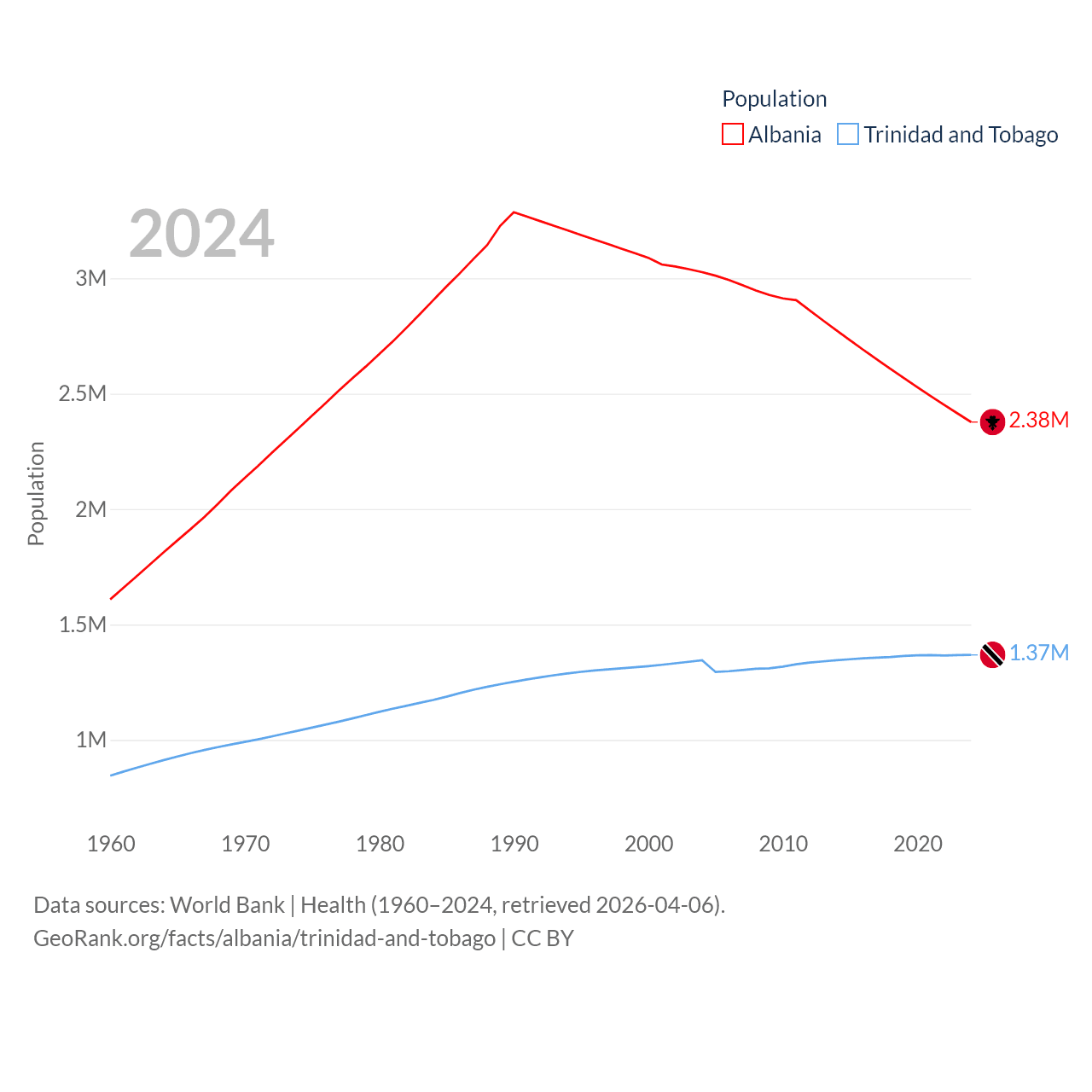 Albania has a population of 2.38M (ranked 144/197), compared with 1.37M in Trinidad and Tobago (ranked 154/197). Albania's land area is 10,579 sq mi versus 1,981 sq mi for Trinidad and Tobago (ranked 143rd vs. 166th).