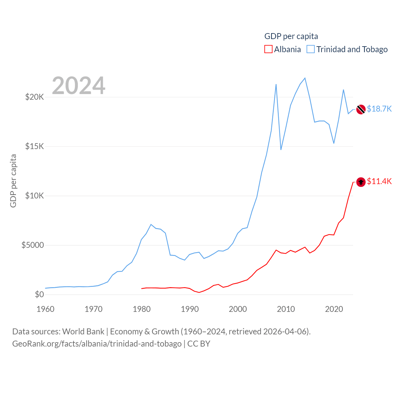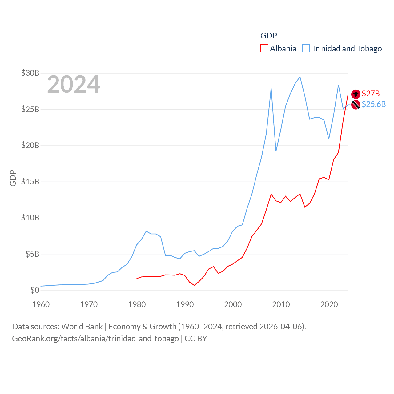 By GDP, Albania ranks 112/197 ($27B) and Trinidad and Tobago ranks 115/197 ($25.6B). By GDP per capita, Albania ranks 82/197 ($11,378), while Trinidad and Tobago ranks 61/197 ($18,733).