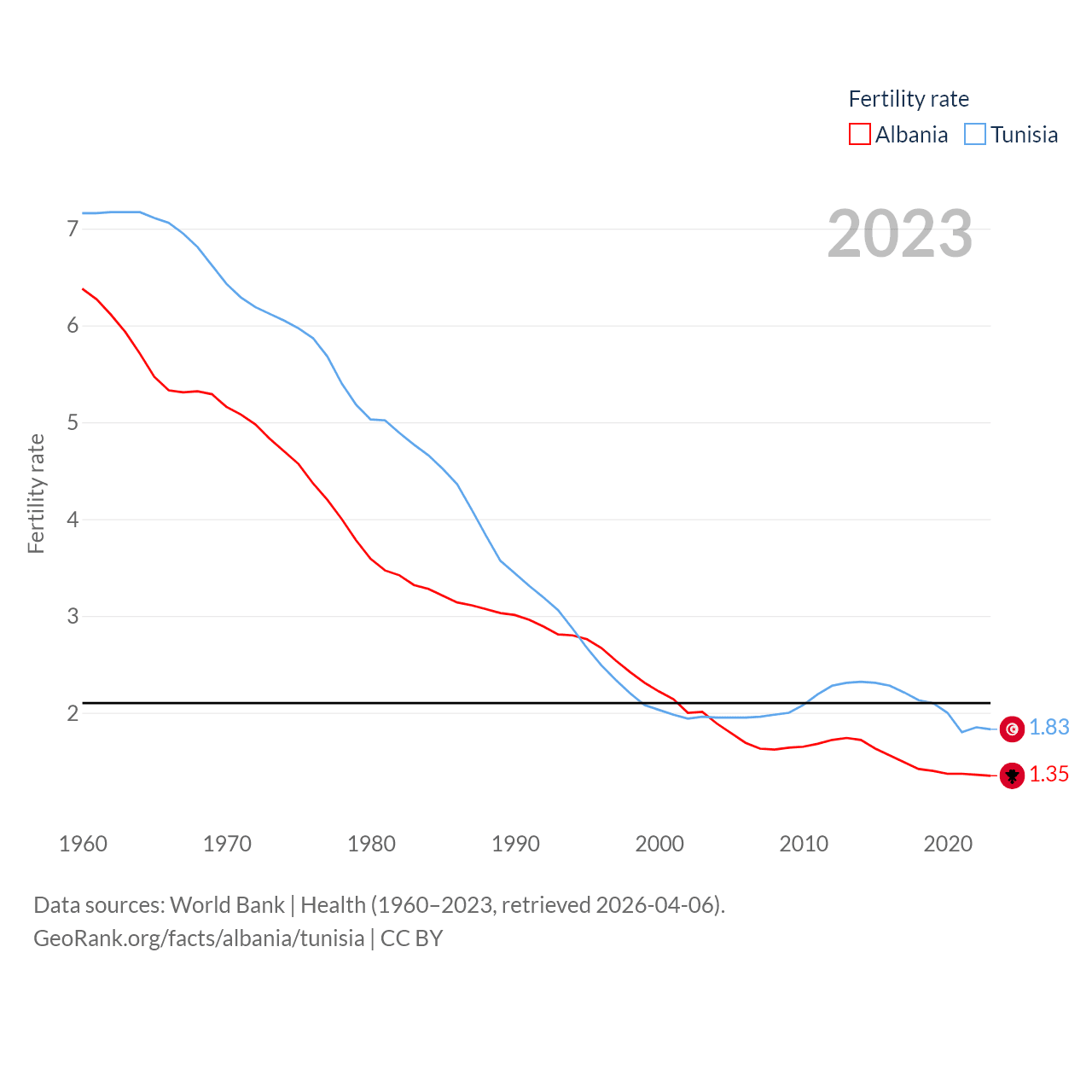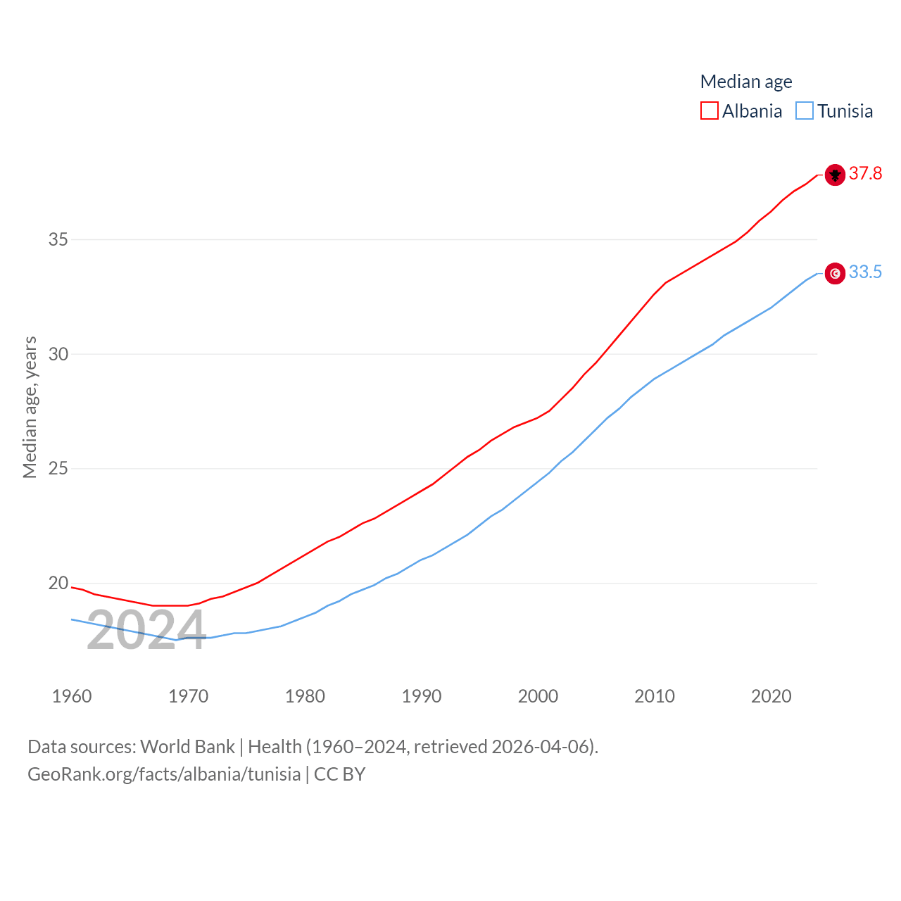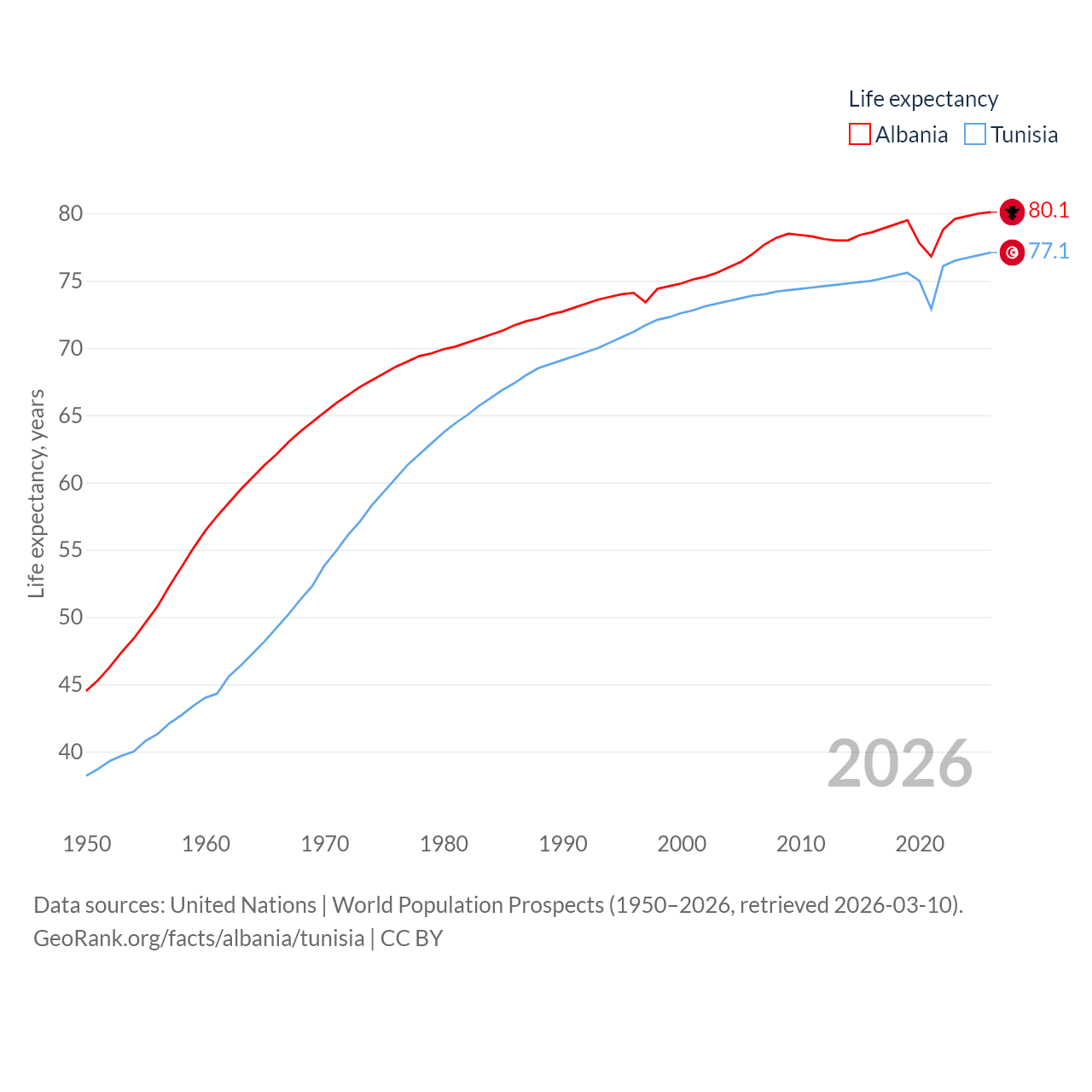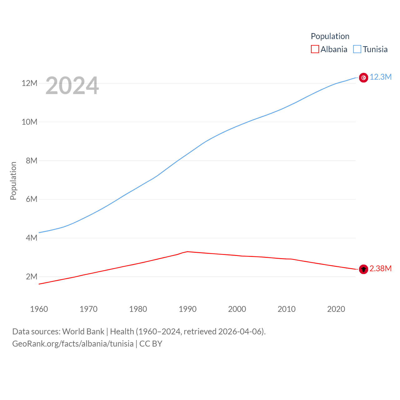 Albania has a population of 2.38M (ranked 144/197), compared with 12.3M in Tunisia (ranked 80/197). Albania's land area is 10,579 sq mi versus 59,985 sq mi for Tunisia (ranked 143rd vs. 91st).
