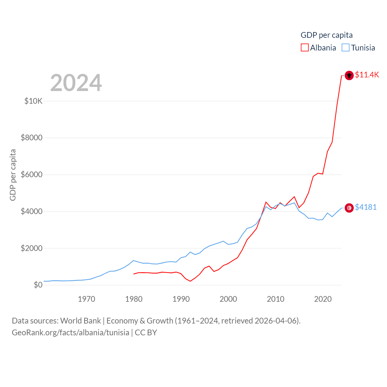 By GDP, Albania ranks 112/197 ($27B) and Tunisia ranks 93/197 ($51.3B). By GDP per capita, Albania ranks 82/197 ($11,378), while Tunisia ranks 129/197 ($4,181).