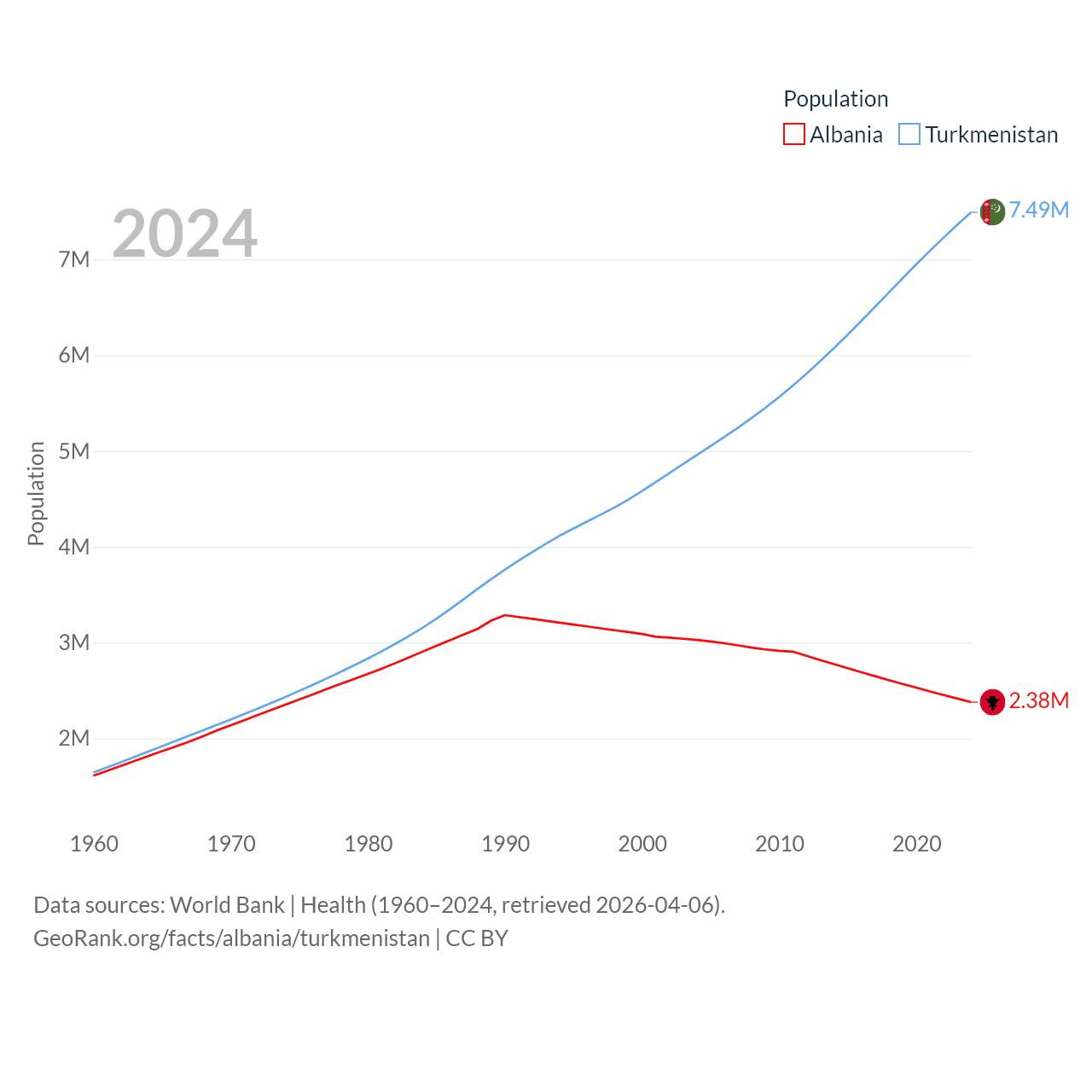 Albania has a population of 2.38M (ranked 144/197), compared with 7.49M in Turkmenistan (ranked 104/197). Albania's land area is 10,579 sq mi versus 181,441 sq mi for Turkmenistan (ranked 143rd vs. 53rd).