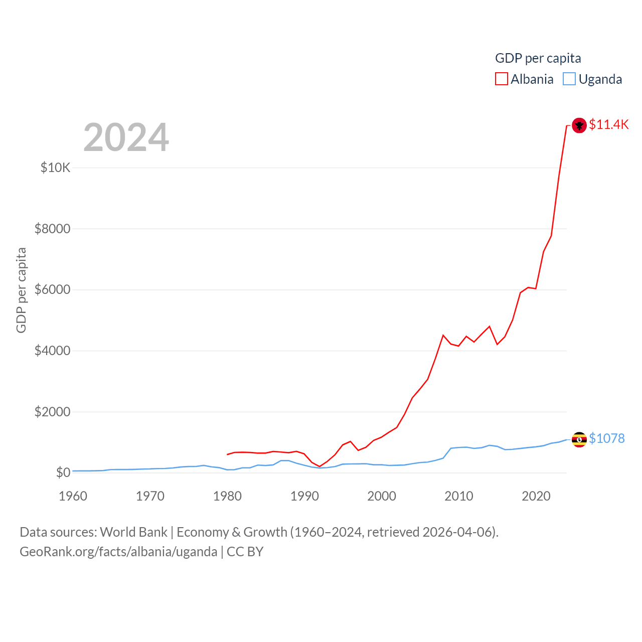 By GDP, Albania ranks 112/197 ($27B) and Uganda ranks 89/197 ($53.9B). By GDP per capita, Albania ranks 82/197 ($11,378), while Uganda ranks 176/197 ($1,078).