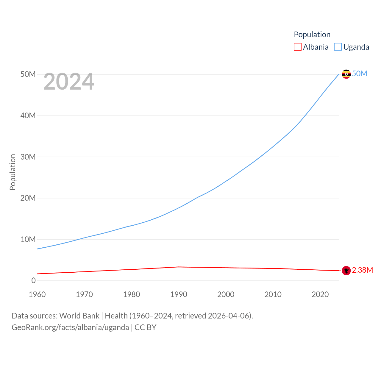 Albania has a population of 2.38M (ranked 144/197), compared with 50M in Uganda (ranked 31/197). Albania's land area is 10,579 sq mi versus 77,421 sq mi for Uganda (ranked 143rd vs. 84th).