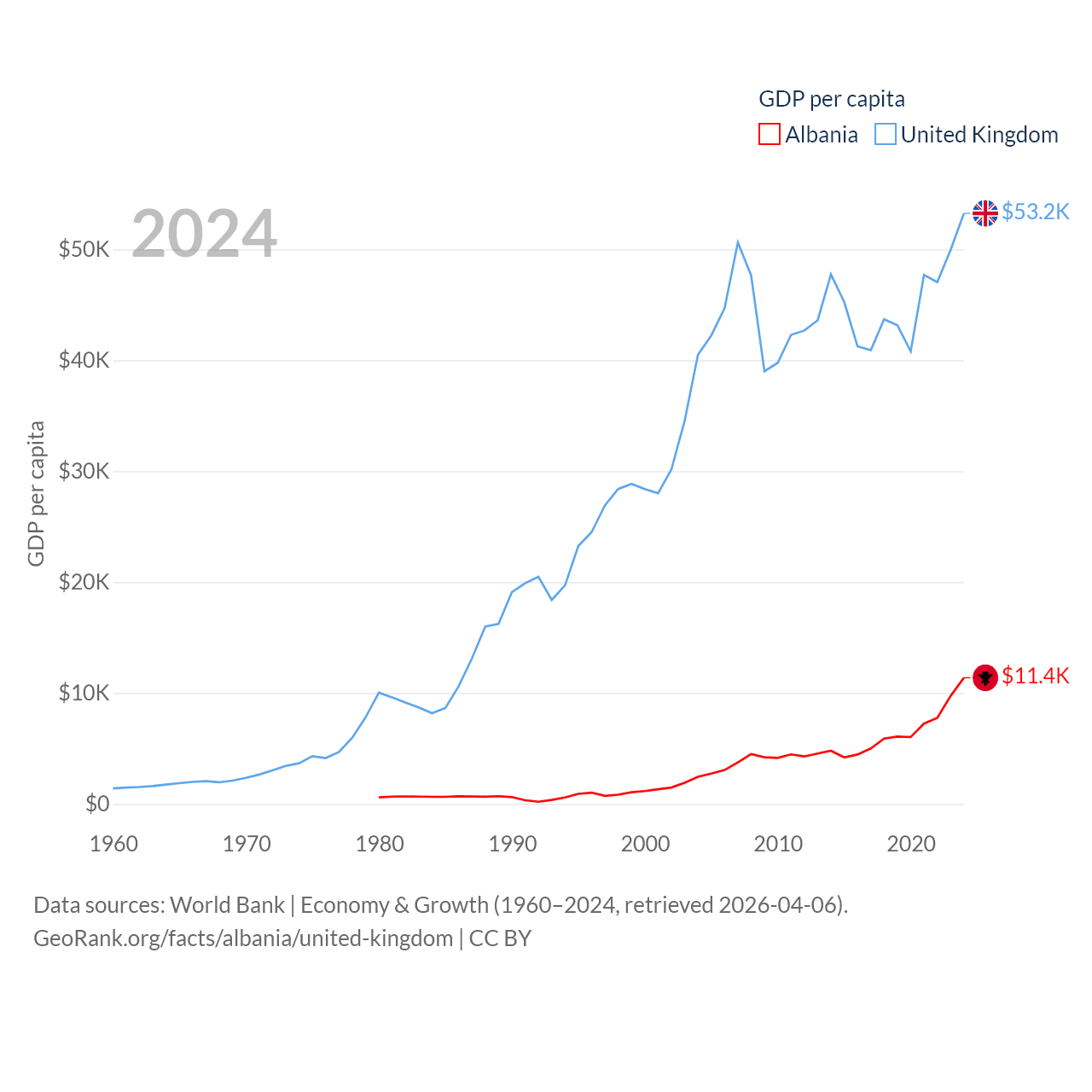 By GDP, Albania ranks 112/197 ($27B) and The United Kingdom ranks 6/197 ($3.69T). By GDP per capita, Albania ranks 82/197 ($11,378), while The United Kingdom ranks 22/197 ($53,246).