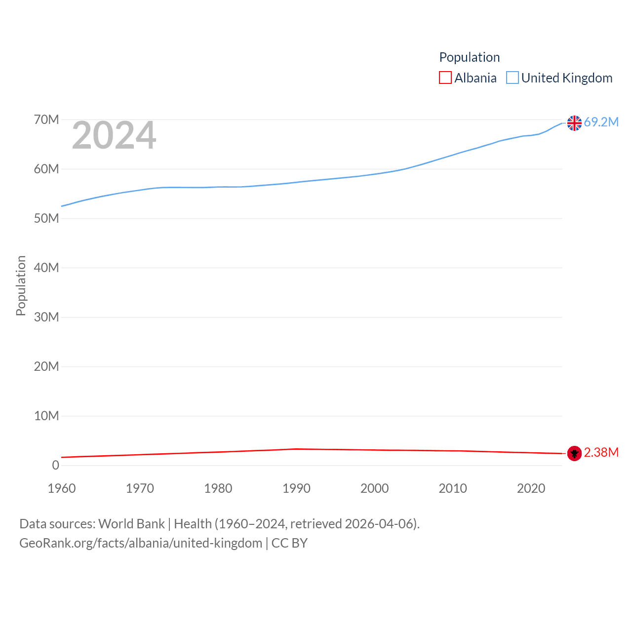 Albania has a population of 2.38M (ranked 144/197), compared with 69.2M in The United Kingdom (ranked 21/197). Albania's land area is 10,579 sq mi versus 93,410 sq mi for The United Kingdom (ranked 143rd vs. 78th).