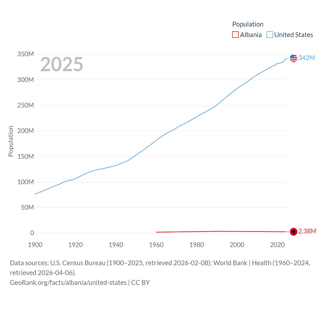 Albania has a population of 2.38M (ranked 144/197), compared with 342M in The United States (ranked 3/197). Albania's land area is 10,579 sq mi versus 3,531,839 sq mi for The United States (ranked 143rd vs. 3rd).