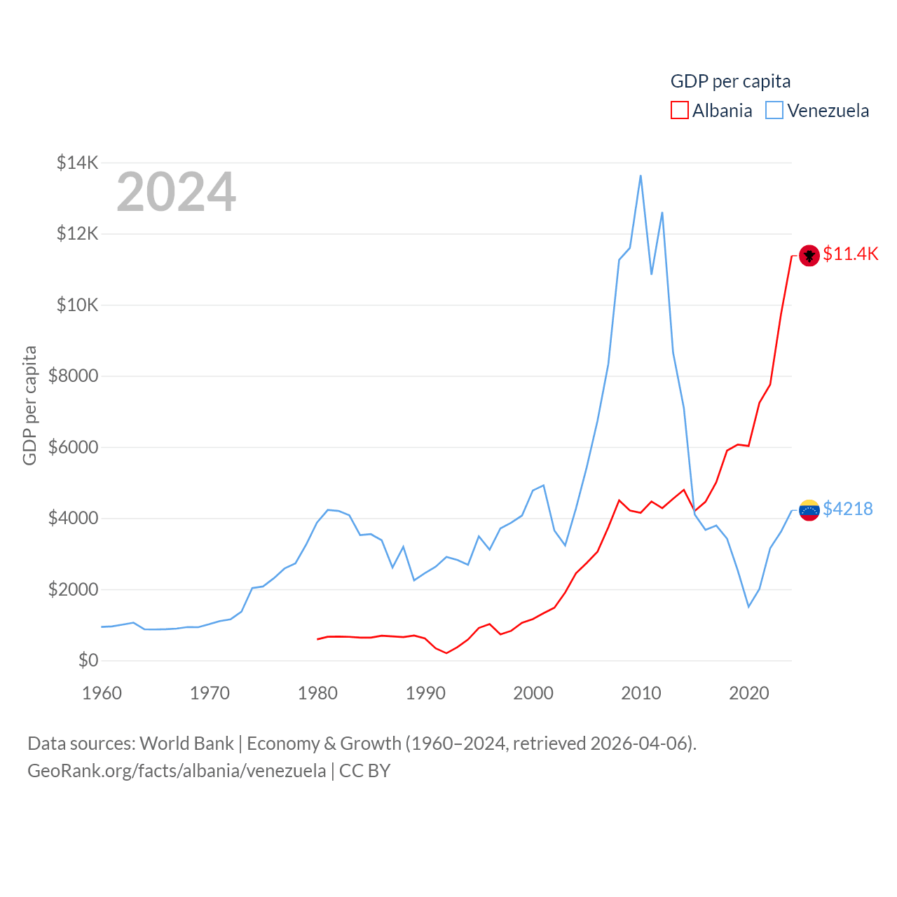 By GDP, Albania ranks 112/197 ($27B) and Venezuela ranks 65/197 ($120B). By GDP per capita, Albania ranks 82/197 ($11,378), while Venezuela ranks 128/197 ($4,218).